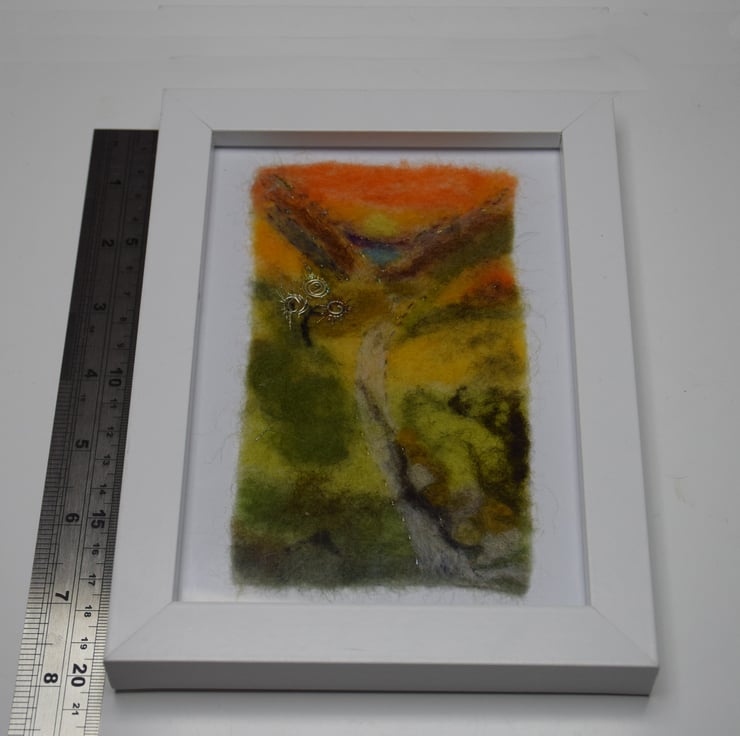 Introducing my latest abstract felt art with brilliant sunset over a Cumbrian valley with the hint of a lake in the distance. The silver embellishment on the left of the felt picture is Celtic inspired and the combination of felt and silver makes this a very special gift for a Silver Wedding Anniversary or a personal gift to someone special.