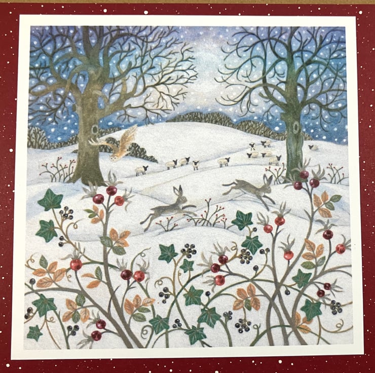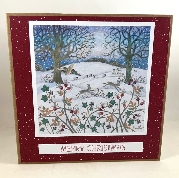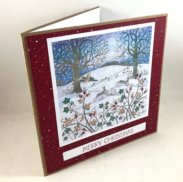 Square, kraft Christmas card featuring a wintry image of hares running across snow covered fields with festive ivy and berries in the foreground. The image has been overlaid onto dark red and white splatter patterned background paper. The sentiment reads: 'Merry Christmas'.