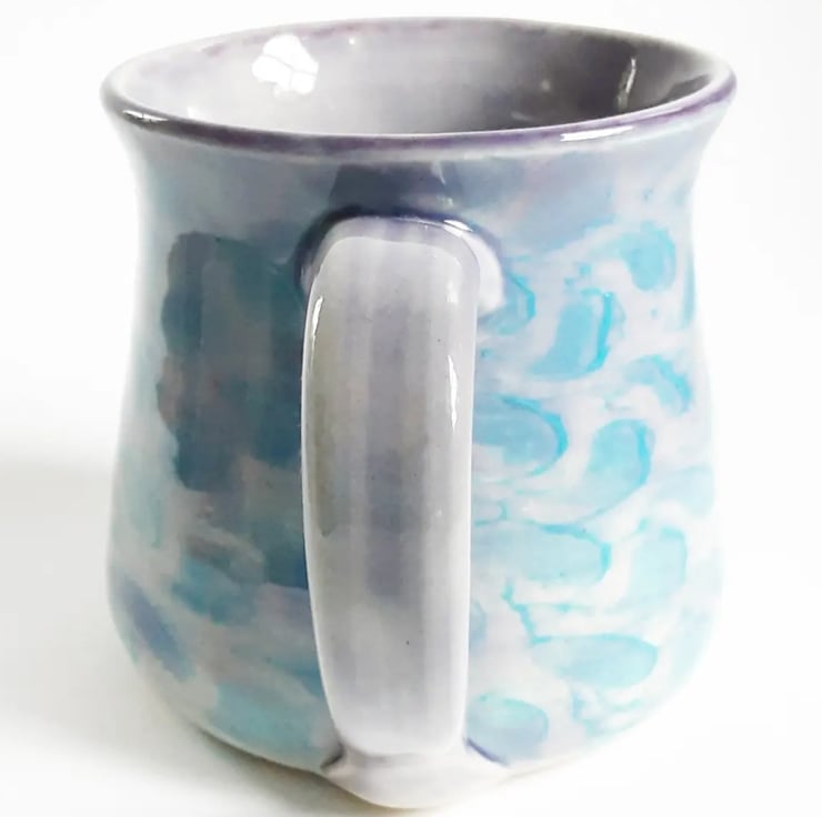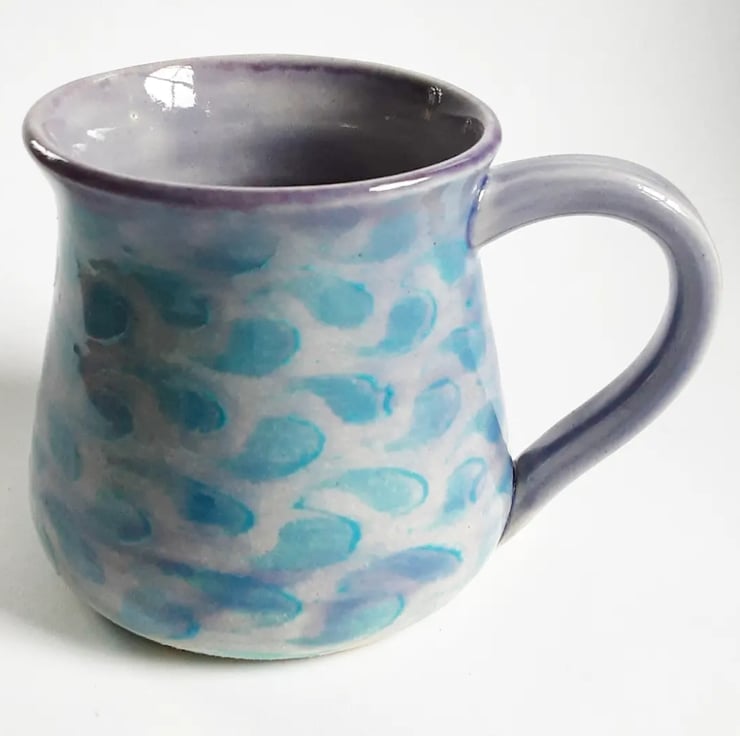 Glazed in blue and lilac glazes with a pattern on the mug.