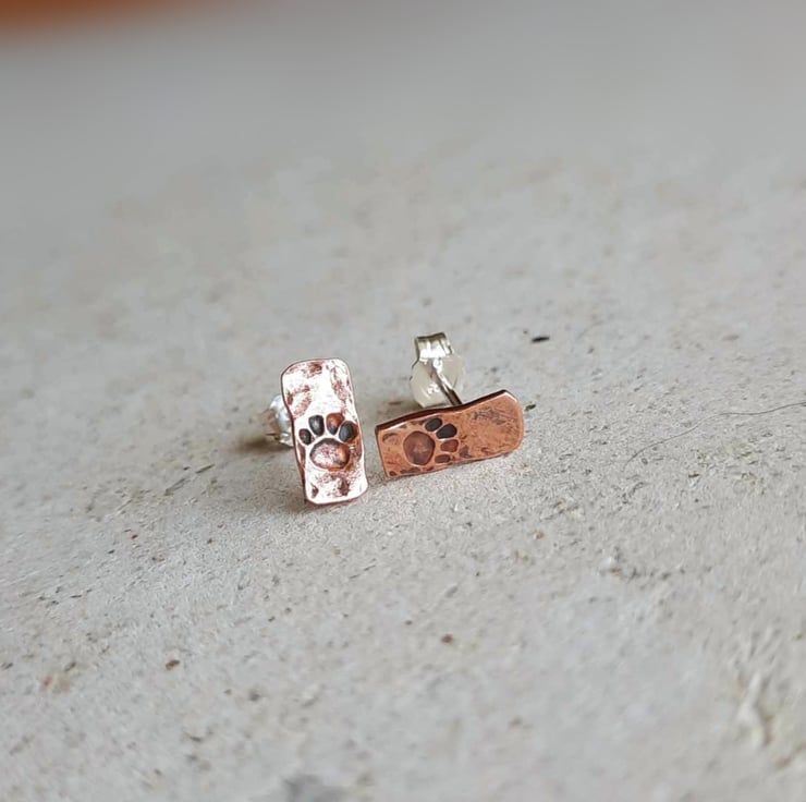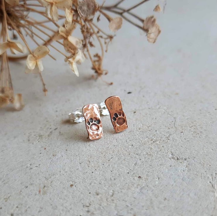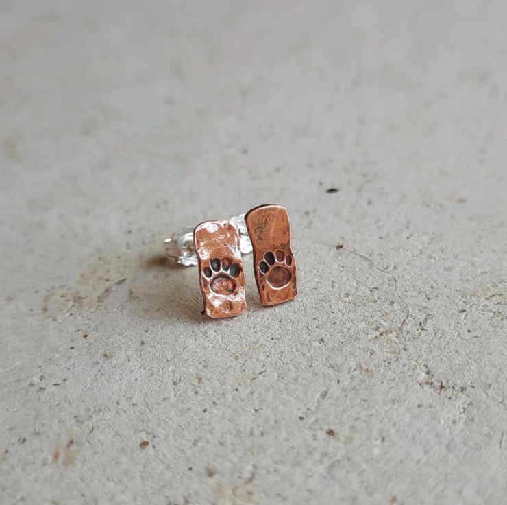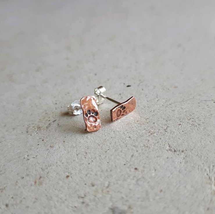 Cute, rustic style copper paw print stud earrings, hand crafted from offcuts of pure copper wire left over from making bangles and rings. Due to the nature of the creation process, these earrings are slightly irregular in shape.