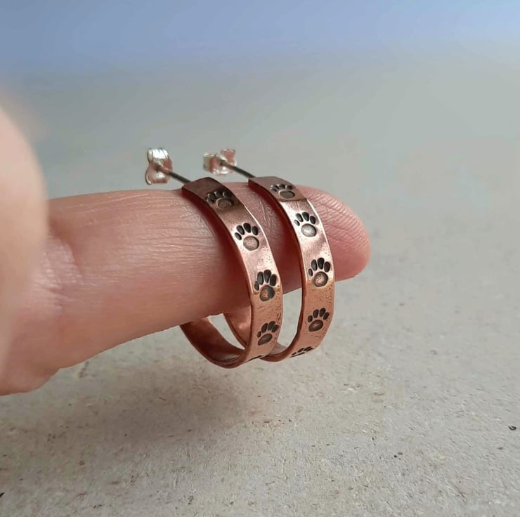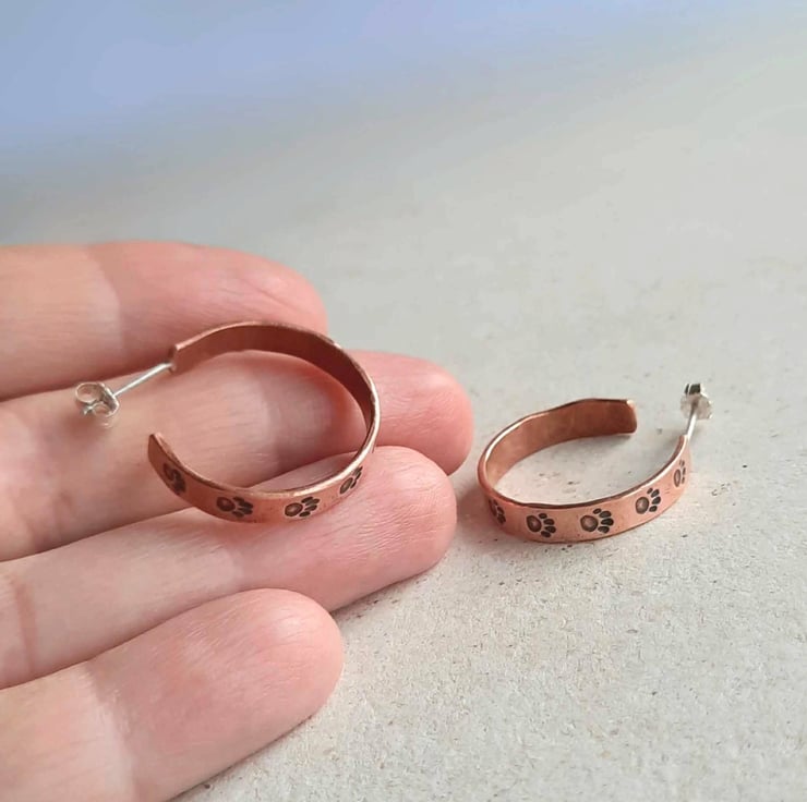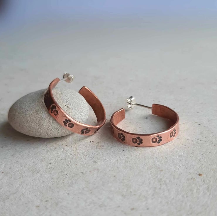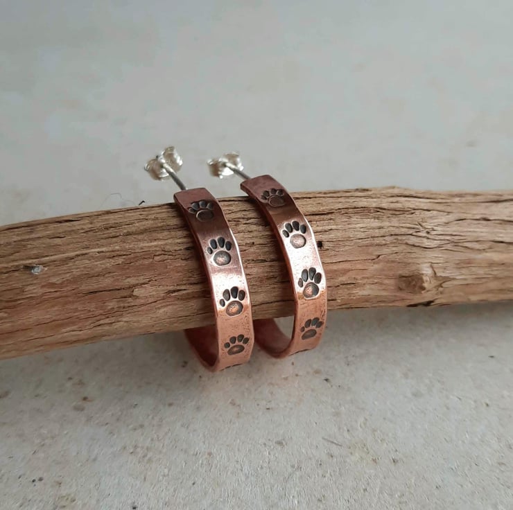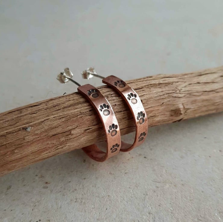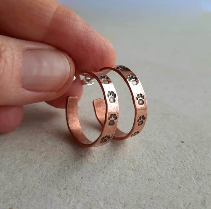 Pretty, rustic style copper paw print hoop stud earrings, hand crafted from pure copper wire which is hammered flat and hand stamped with tiny paw prints.