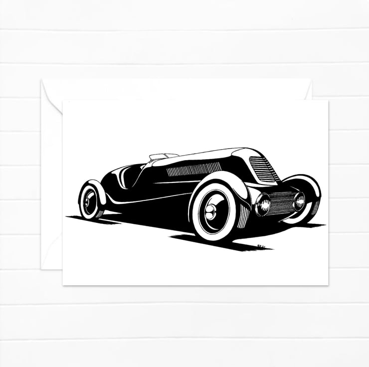 An original art greeting card, featuring a hand drawn pen and ink illustration of a unique American car from the 1930s.