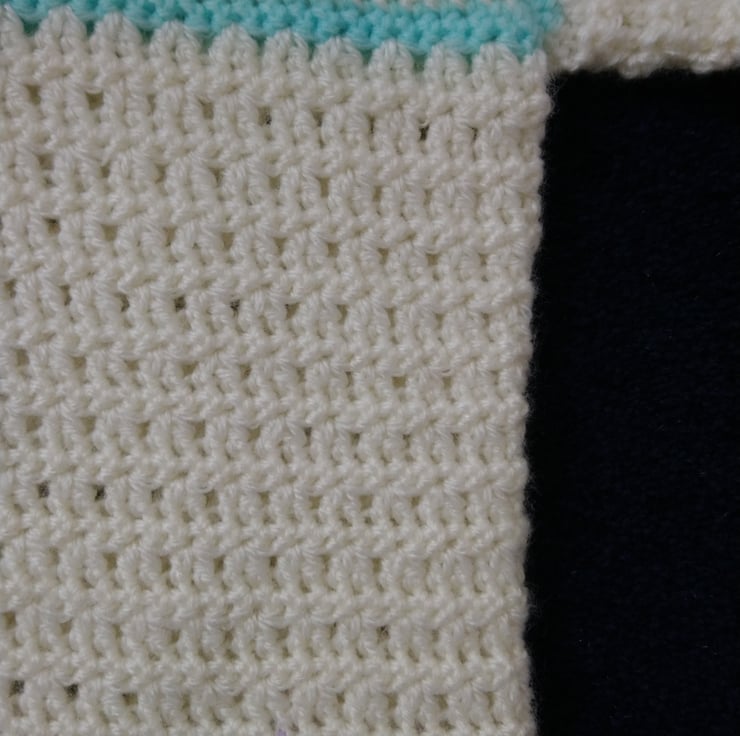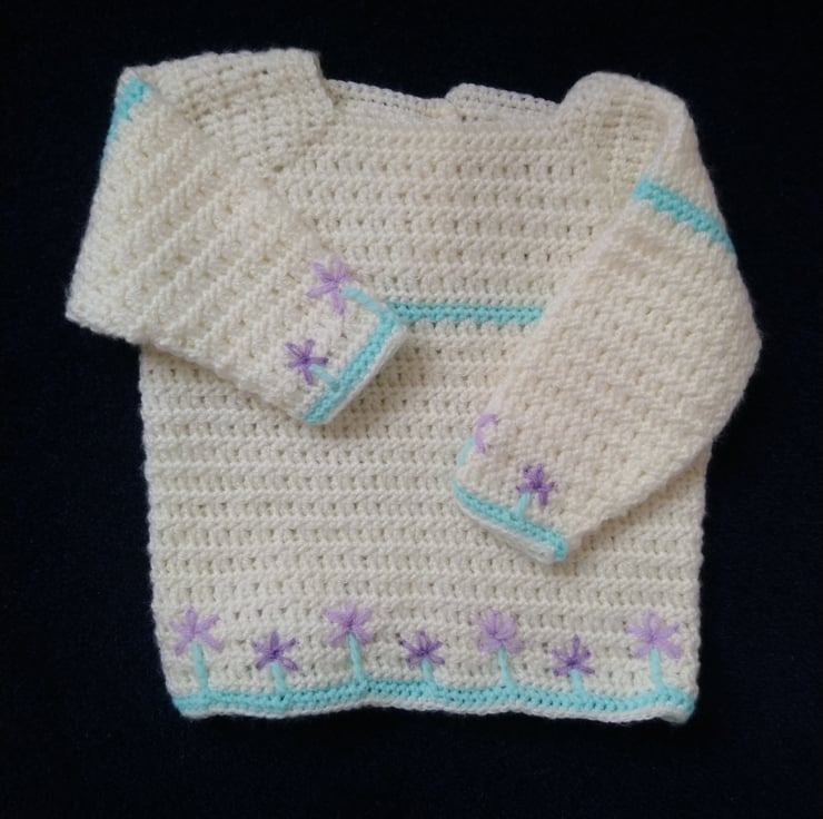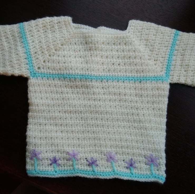 A pretty crochet baby jumper in a cosy cream double knitting weight acrylic yarn, with a peppermint green stripe at the edges and mauve flowers around the bottom. Fastens at the back with 3 buttons.