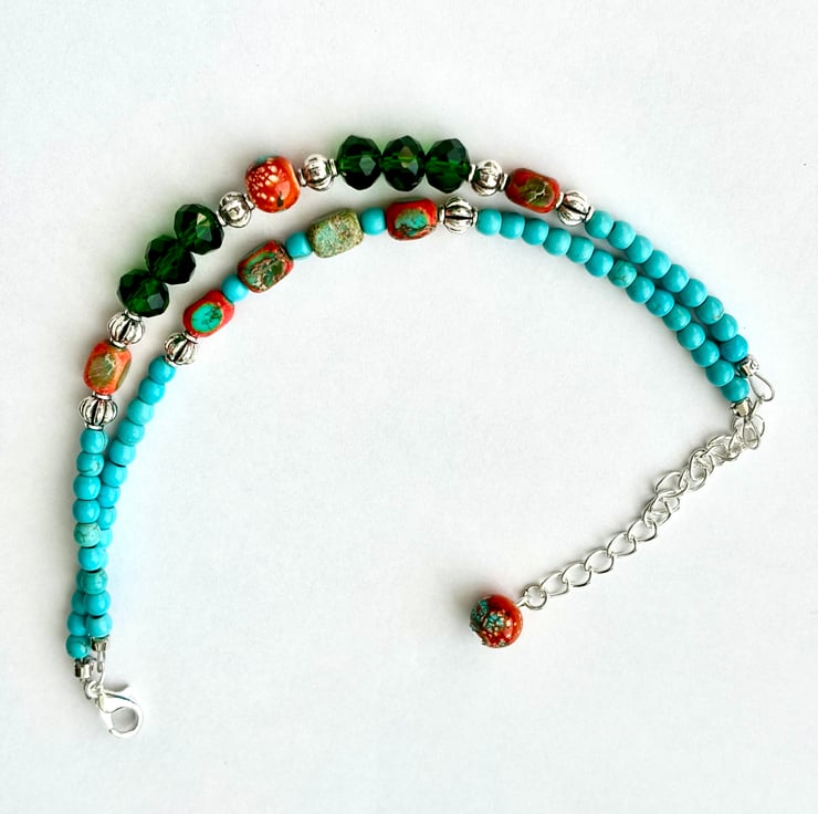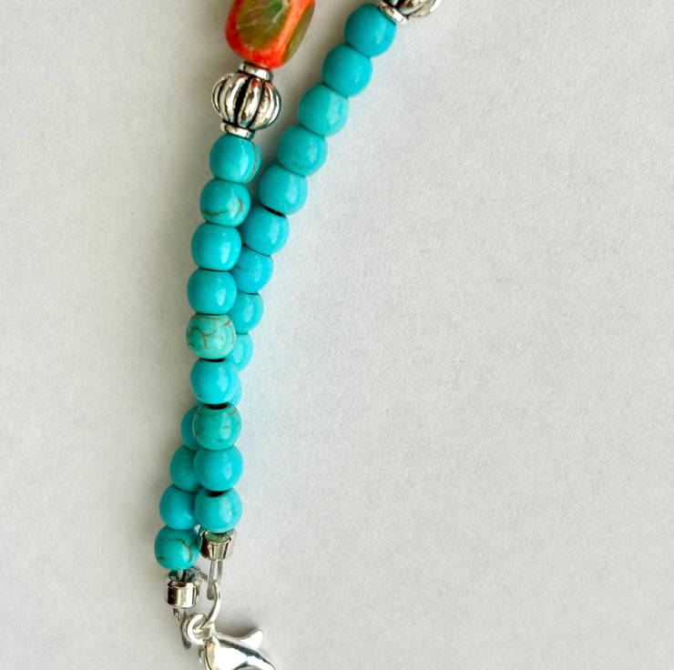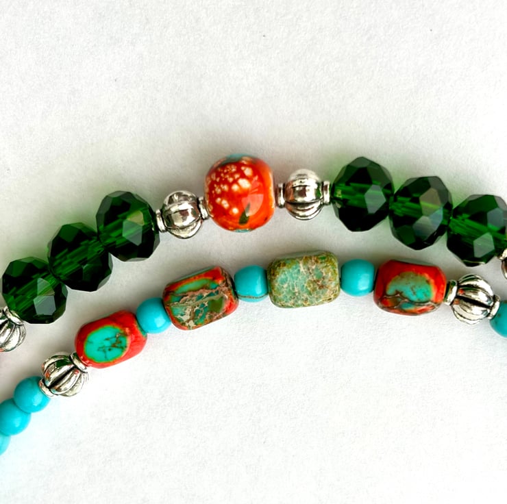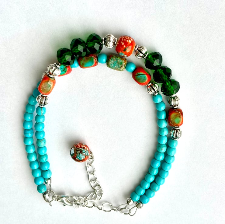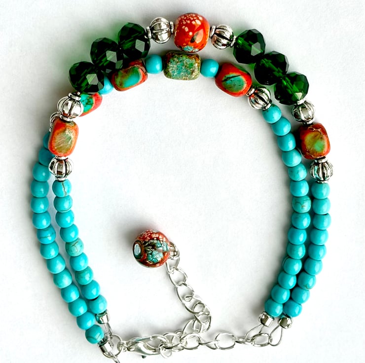 This 7” Double strand Bracelet handmade with love, has 4mm Turquoise stone beads, with an 8mm round glass Orange and blue focal bead, unusual irregular rectangle beads in orange and blue, with dark green precocia crystal beads all set on silver coloured wire with a lobster clasp and extender chain with a focal bead charm.
