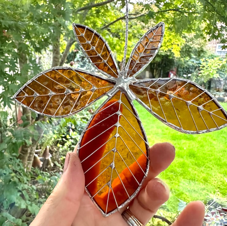 Clockwise from top left the glass used is amber hammered glass, amber sea glass, amber sparkle glass. The leaf at the top has now sold.