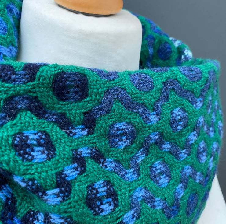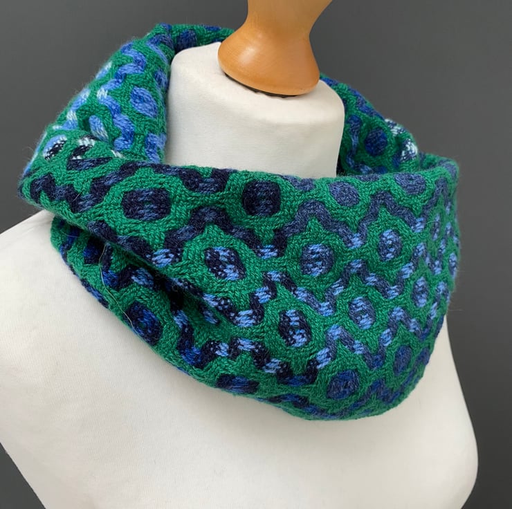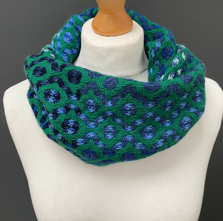 A unique one of a kind merino lambswool snood scarf. Woven with fine merino yarn on a floor loom by weaver Emma Baker. This snood is made with handwoven fabric woven with a deflected doubleweave design which has created an airy, lightweight and warm fabric. A one of a kind accessory which would make a beautiful luxury gift.