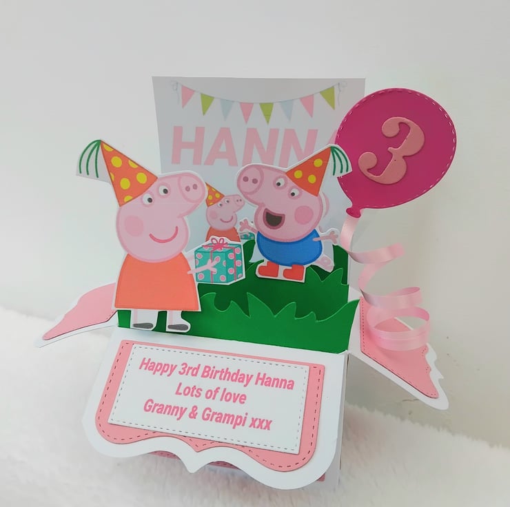 HANDMADE PERSONALISED PEPPA POP UP CARD BOX, PERSONALISED PEPPA CENTREPIECE (ANY AGE)