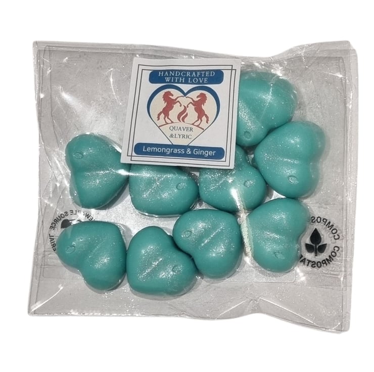 10 luxurious soy wax melt hearts. Handcrafted with premium-quality, responsibly sourced soy wax, infused with Lemongrass and Ginger fragrance - A zingy, citrusy yet sophisticated scent featuring top notes of lemongrass, Sicilian lemons and juicy limes supported by spicy heart of ginger root and grated nutmeg with a hint of eucalyptus and enhanced by a sensual base of patchouli, white woods and creamy vanilla.The melts are finished with a light dusting of ice mica to add a shimmer.