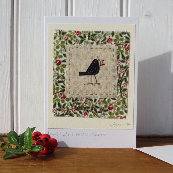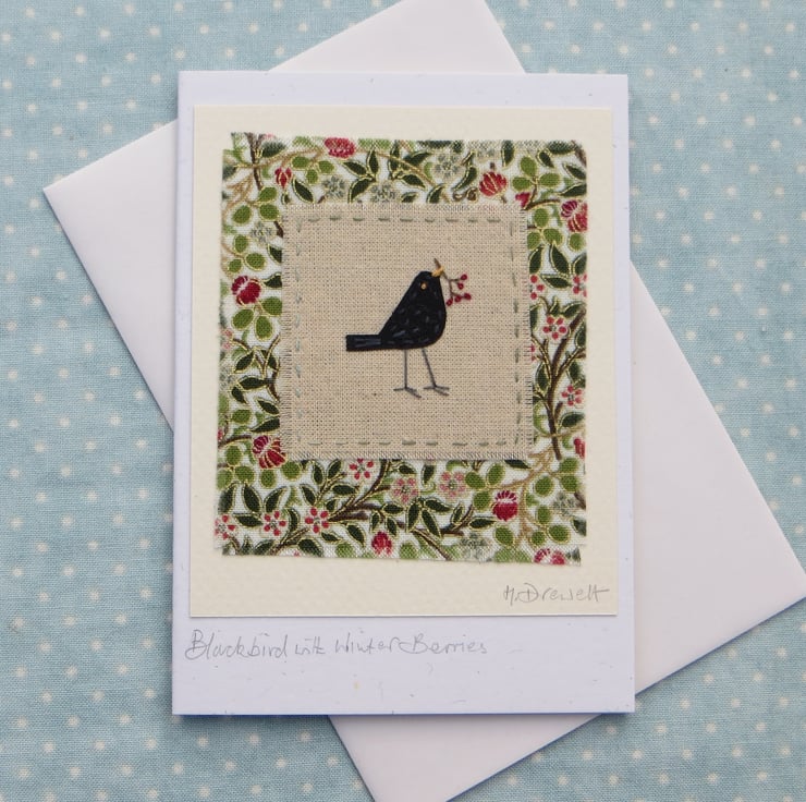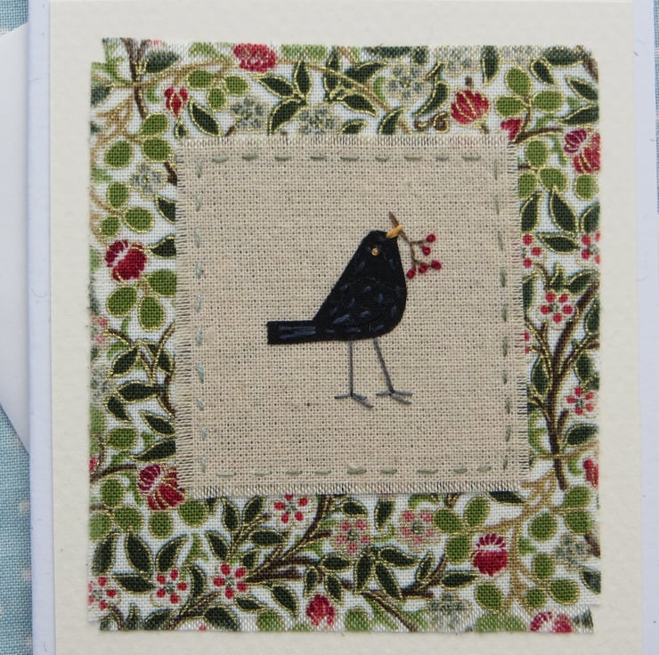 This is a small handmade greeting card featuring a miniature hand-stitched applique blackbird with intricate embroidered details, mounted on to a pretty cotton fabric which has gold metallic accents to sparkle in the Christmas candlelight!. It is entitled 'Blackbird with Winter Berries'. Definitely a card to keep!