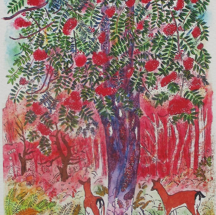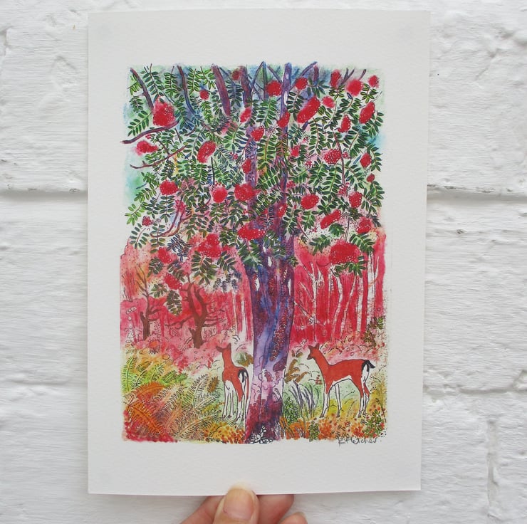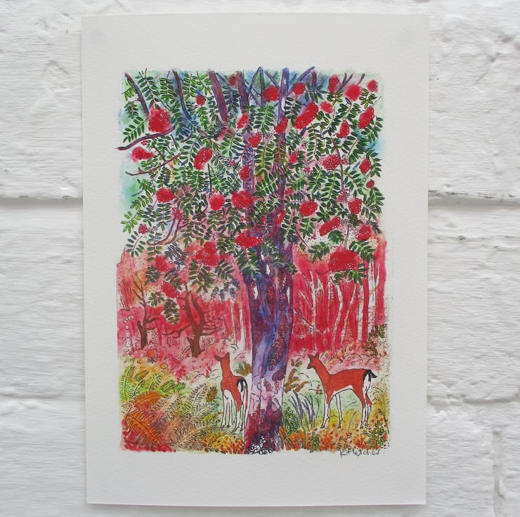 This is an Inkjet print of my mixed media artwork of a deer wandering in a colourful autumn forest where a beautiful Rowan Tree grows.