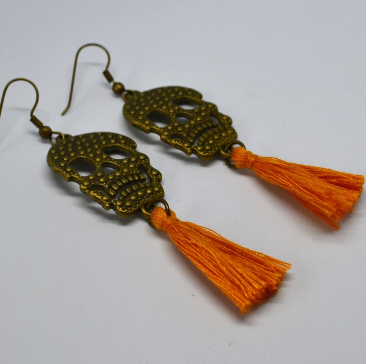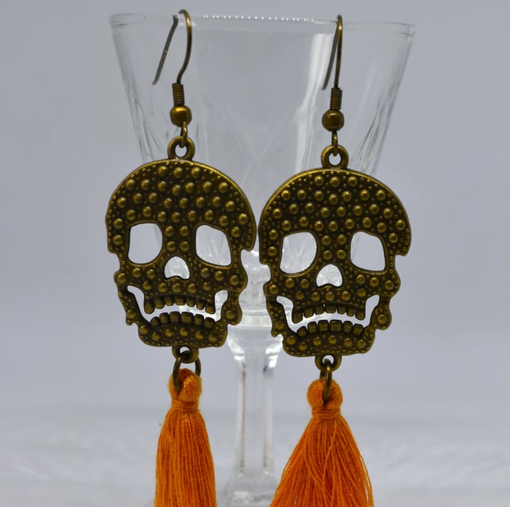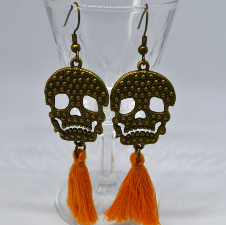 This pair of Halloween themed earrings are nice and light. They are made with antique brass coloured skull connectors and findings. The burnt orange coloured tassels at the base give them a warm autumnal feel. They are approx. 6.5cm from the base of the ear wires. The ear wires can be changed at checkout to sterling silver or Rhodium plated.