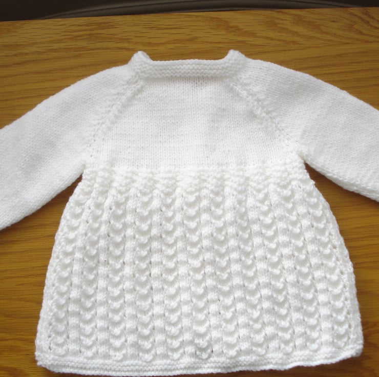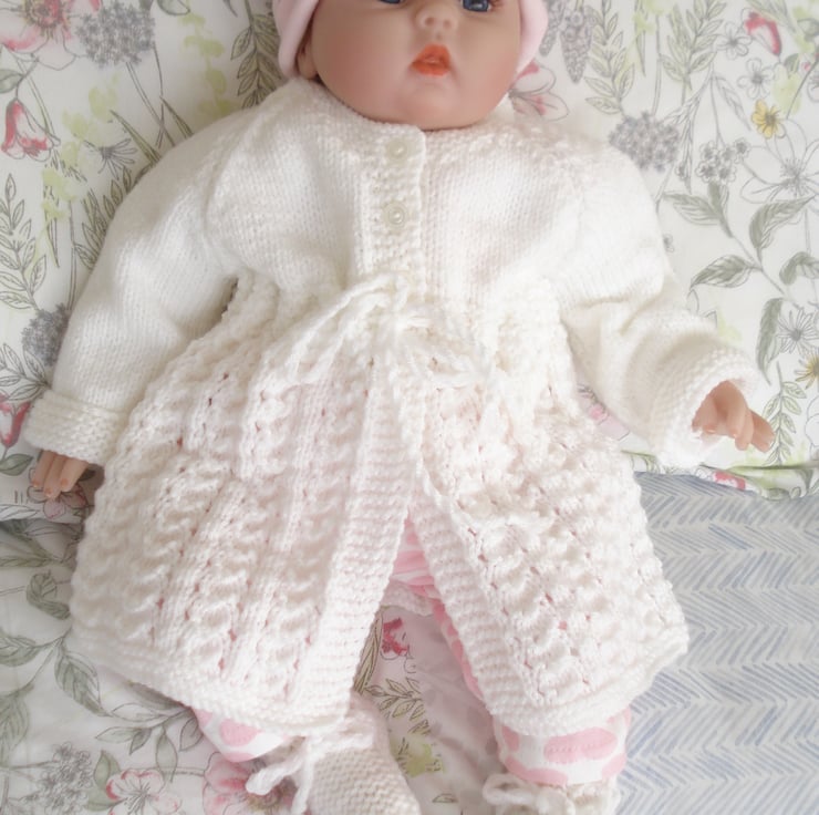 This is a lovely hand knitted set of jacket and bootees. The jacket has three white buttons on the front and all gathered together by a cord. The cord provides the ability for the jacket to fit for a longer length of time as it can be pulled together or even removed. The bootees are also held on by a cord. Actual measurements: I would estimate 3 - 6 months but as there is the cord that could be flexible. Chest maximum without the cord 58cm, back length 34cm, sleeve 15cm.
