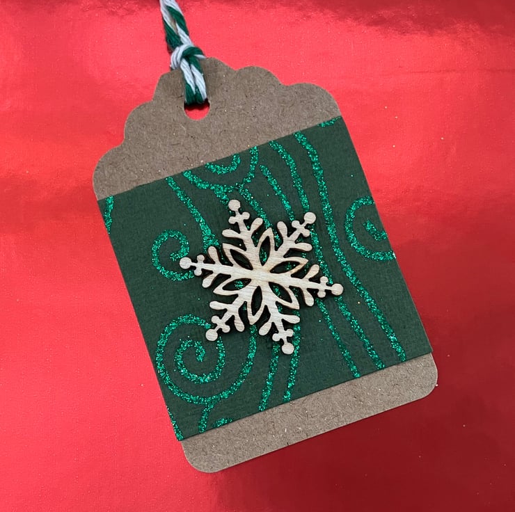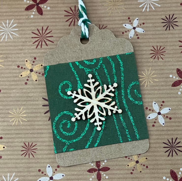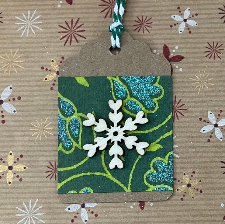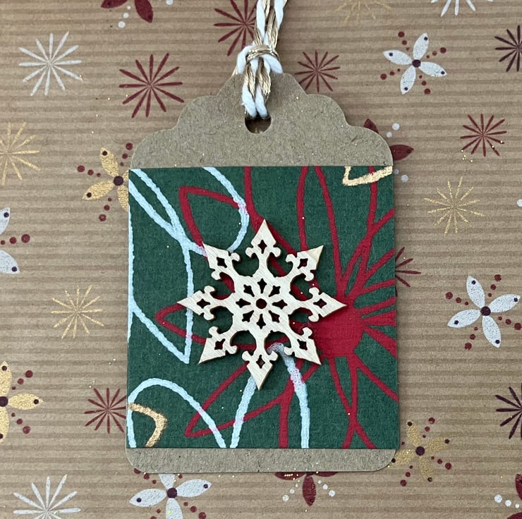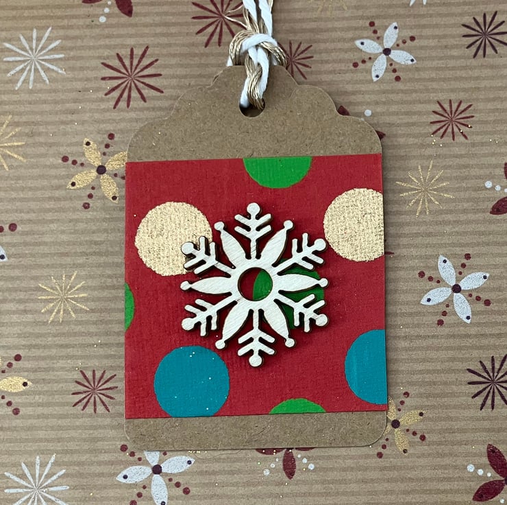 Pack of 4 small kraft gift tags, each with a laser cut wooden snowflake overlaid onto 4 different red, green and gold patterned papers. The reverse is left blank for your own message.