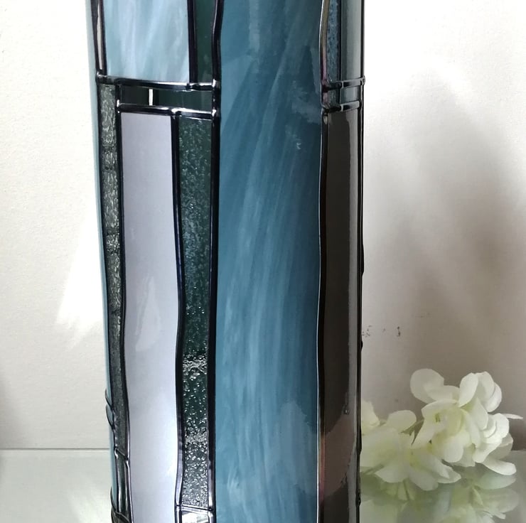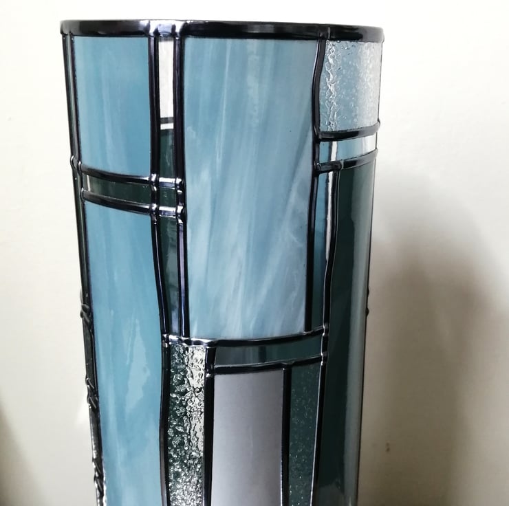 Romantically inspired by fjords and glaciers blending soothing sky blues with soft tones of marbled crisp fjord blue and ice white, not forgetting the seductive crystal frosting. It features four different Art Deco-inspired leaded designs, one on each side.