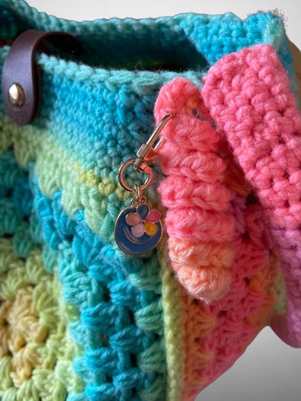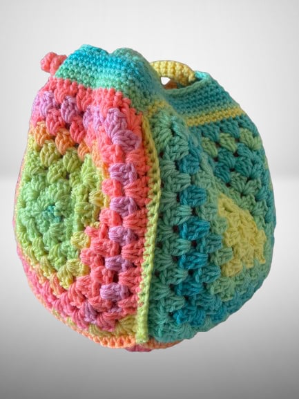 Crafted in neon rainbow yarn crocheted granny squares, it exudes a playful and colorful charm.