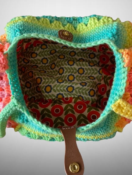 The vintage print fabric lining adds a touch of retro flair, while the crochet twister decoration enhances its unique look.
