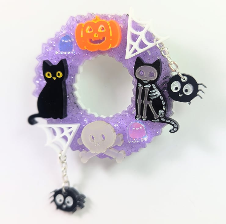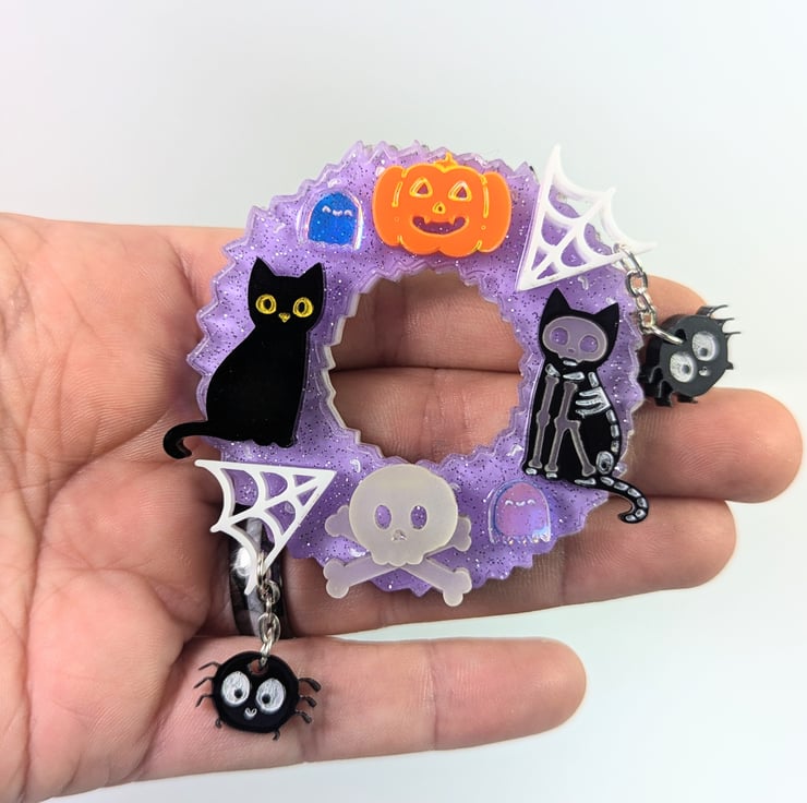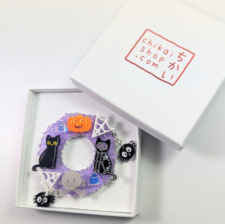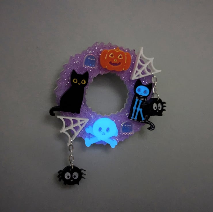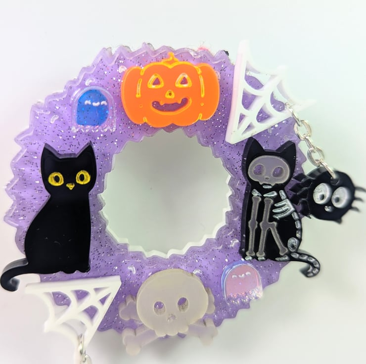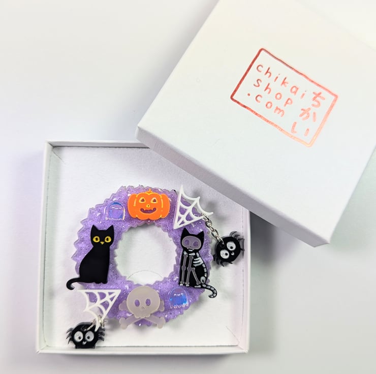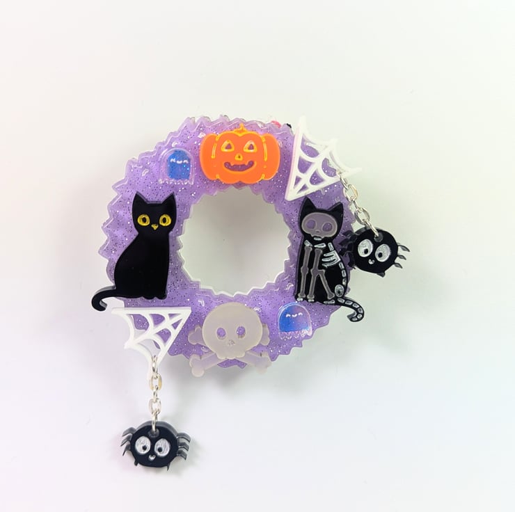 The Halloween wreath brooch is made with different colours of acrylic (including Glitter purple, iridescent and glow-in-the-dark) it has a brooch on the back and hand-painted details. Each piece includes a branded jewellery box made with FSC certified product.