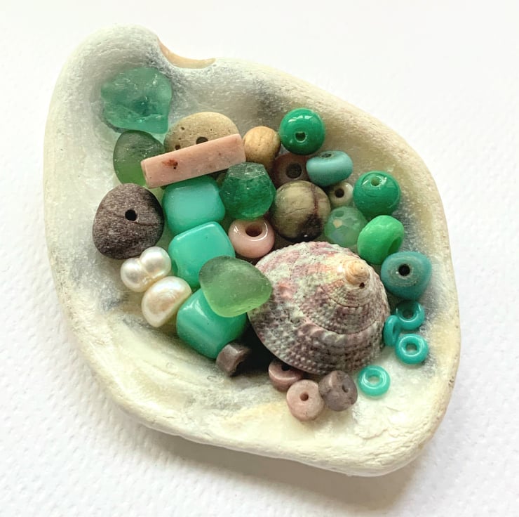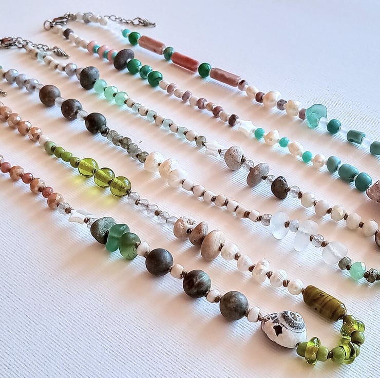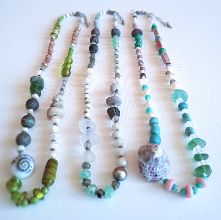 2. Soft greys, greens and pearl. Includes white seaglass, pebbles, crystal rondelle beads, jade, gemstones and a mother-of-pearl star shaped bead.