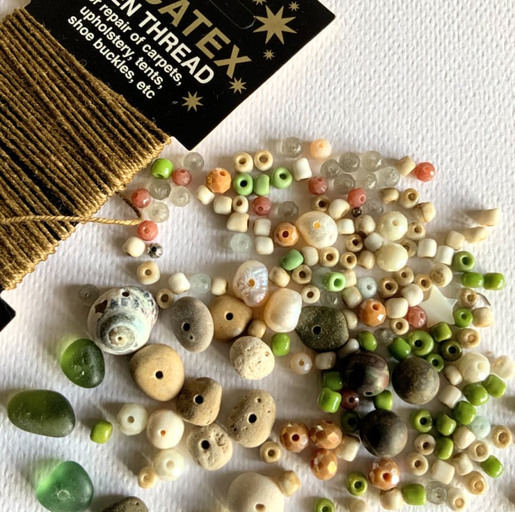 A veritable, eclectic feast of beads. A mash up of beads. Beads made from seaglass, shells, pebbles, pearls, semi-precious gemstones, crystal and glass, all hand-knotted on linen thread.