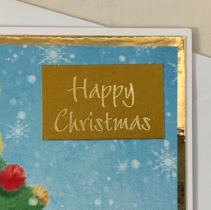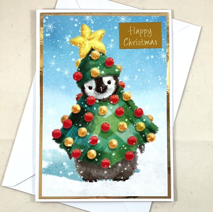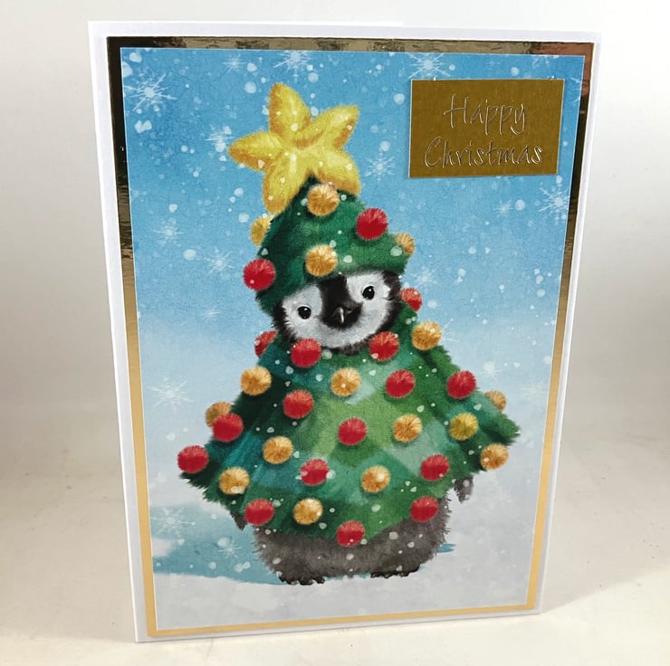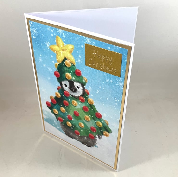 A6 Christmas card with a printed design featuring a cute penguin dressed up like a Christmas tree in red, green and gold. The image has been mounted onto gold mirri card and finished with the foiled sentiment 'Happy Christmas'.