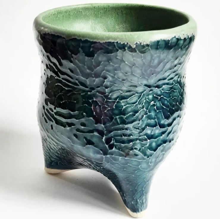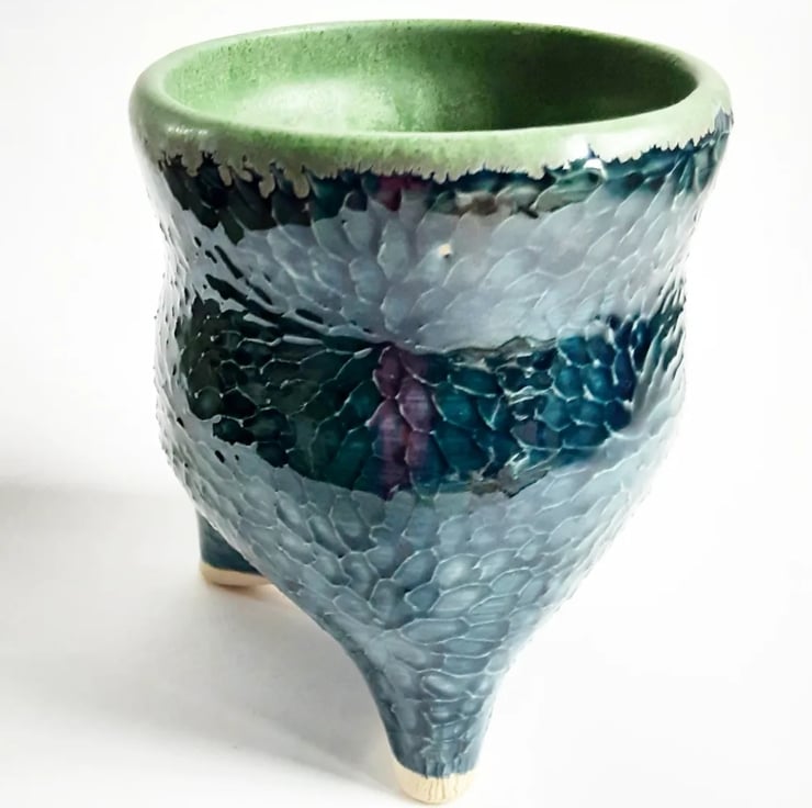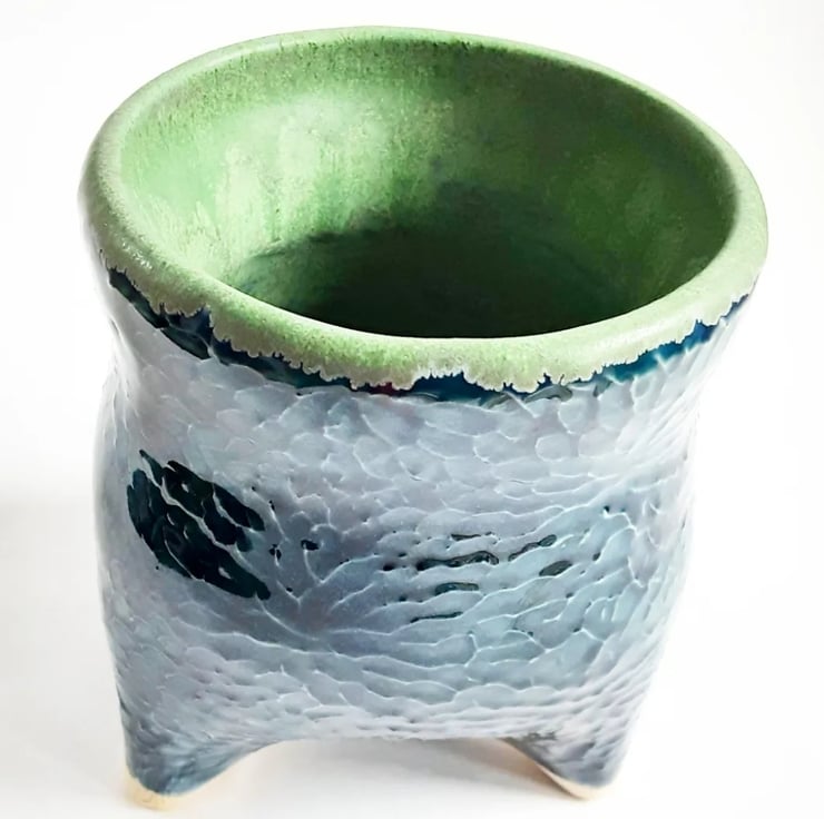 Glazed in navy blue and green glazes on the outside and matt green glaze on the inside. It has a pattern around the outside