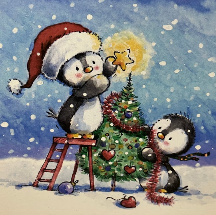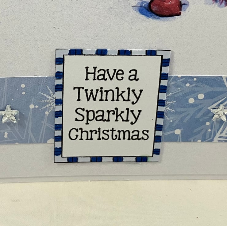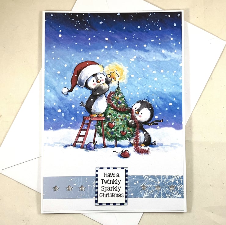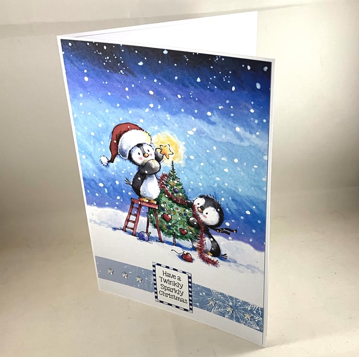 A5 sized Christmas card featuring a printed image of two cute penguins decorating their Christmas tree. The sentiment 'Have a Twinkly Sparkly Christmas' has been overlaid onto a strip of snowflake patterned paper, over the main image and embellished with star shaped adhesive gems.