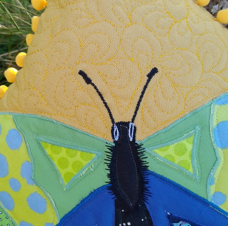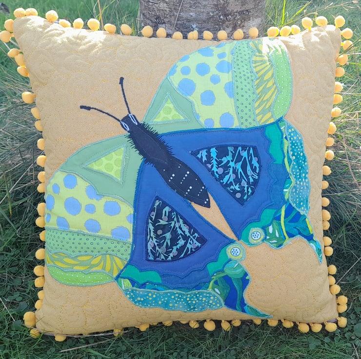 The cushion features a detailed, colorful, applique butterfly design in various patterns and shades of blue and green. The butterfly has prominent, elongated wings adorned with spots and stripes, creating a vibrant and eye-catching centerpiece.