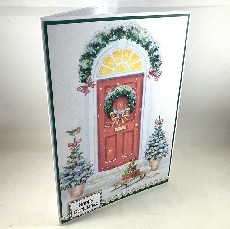 Handmade Christmas card featuring a printed image of a festive front door. The image has been mounted onto dark green card. The sentiment 'Happy Christmas' has been added over a piece of gold and white ric rac ribbon. The snowy elements of the card have been glittered for a bit of extra sparkle.