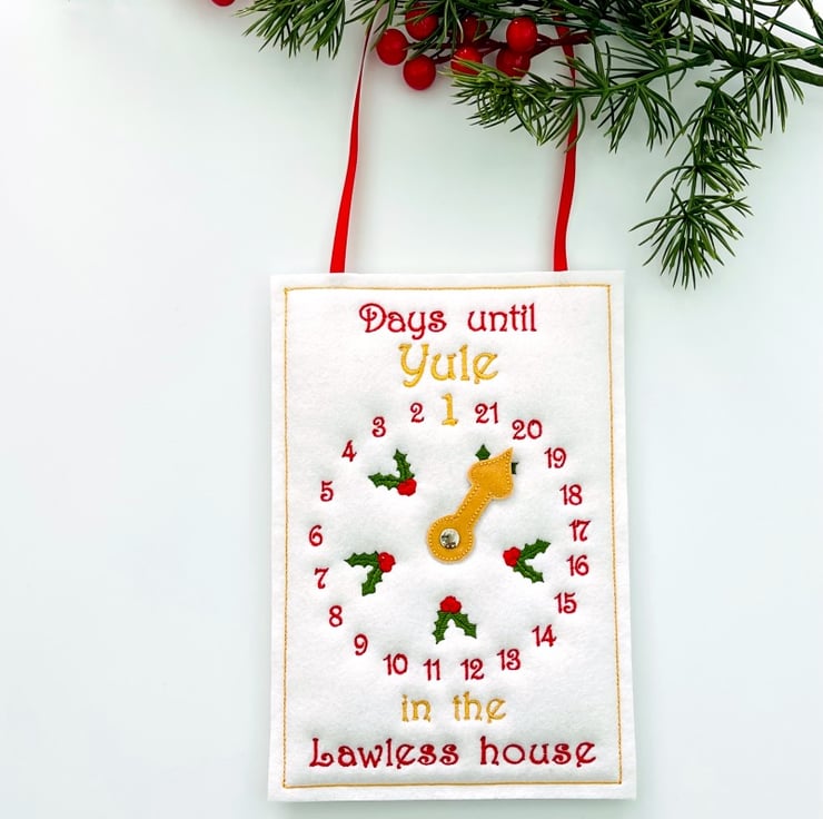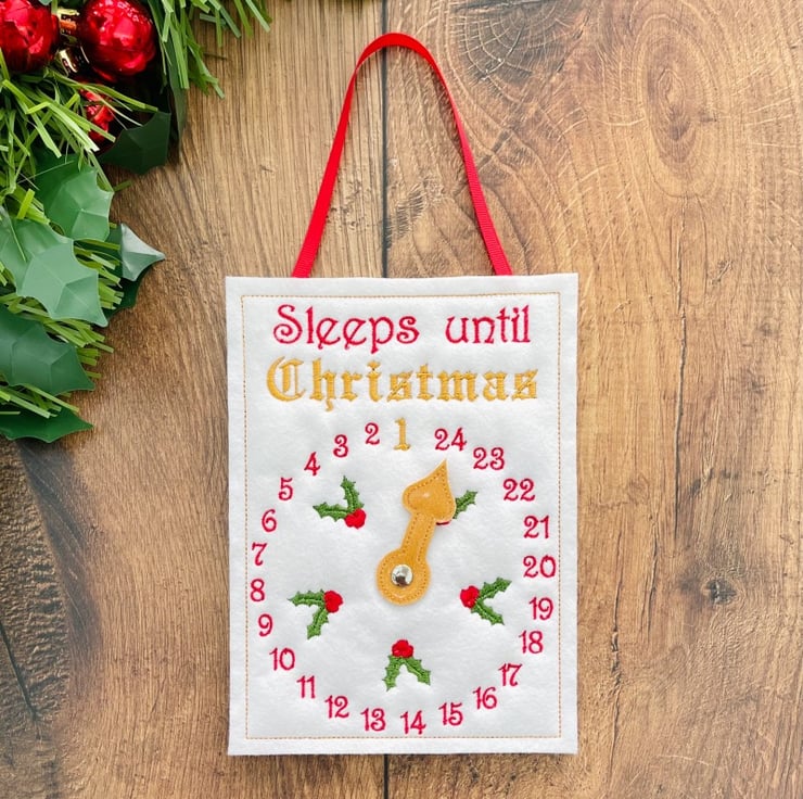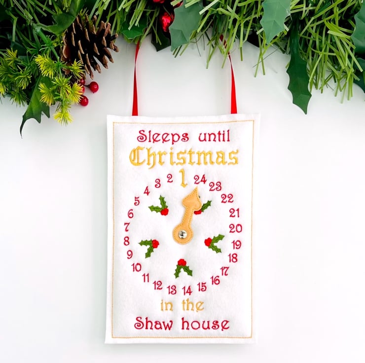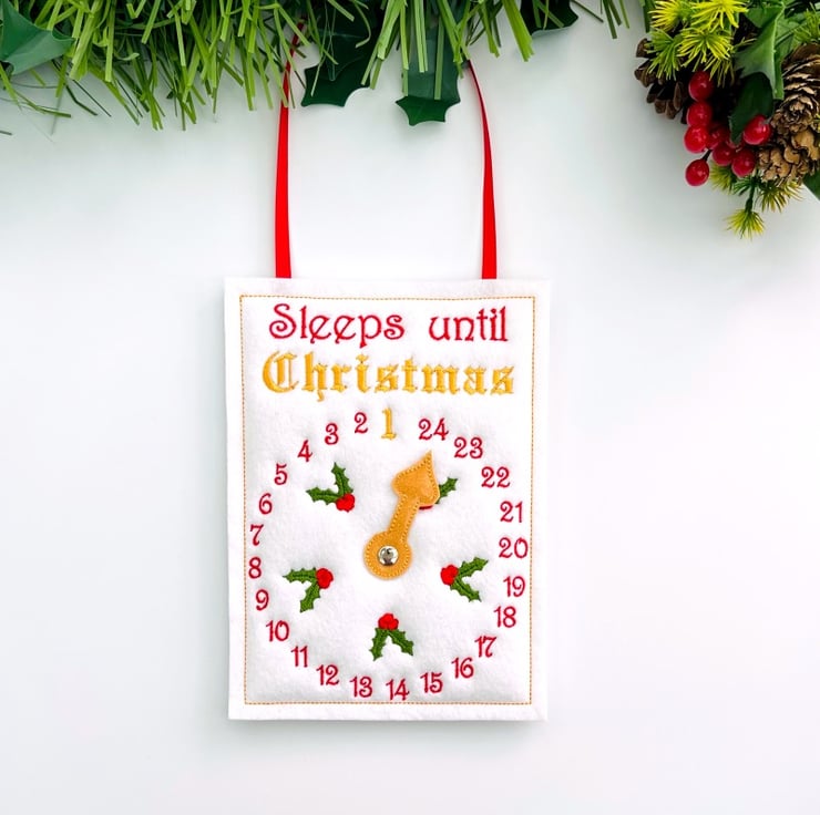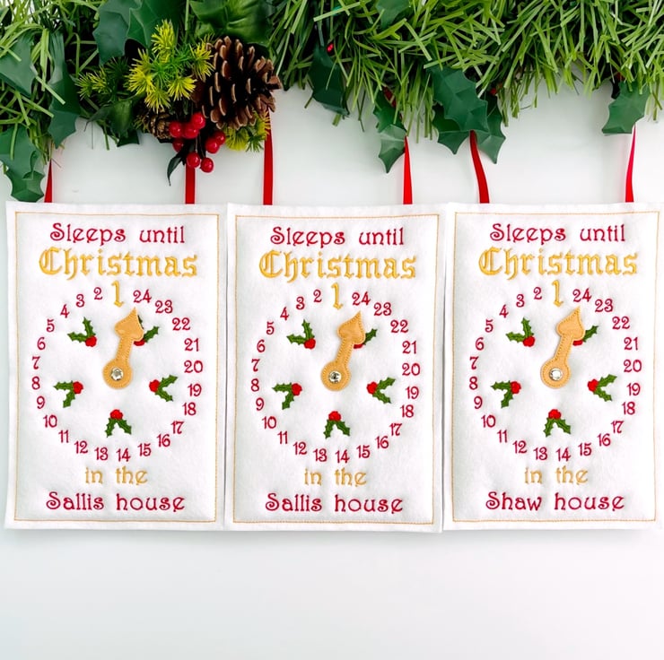 Machine Embroidered details to the front and a vinyl pointer secured to the centre of the clock.