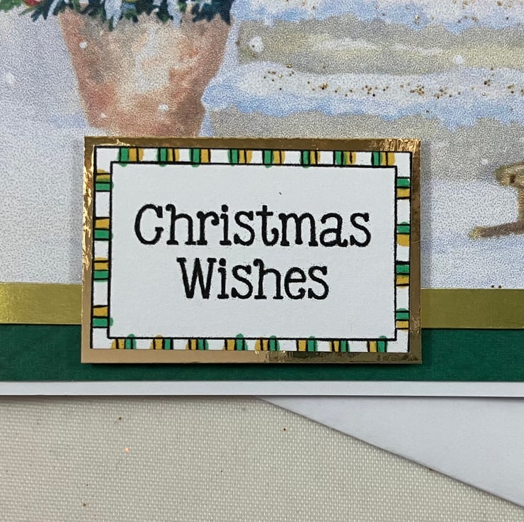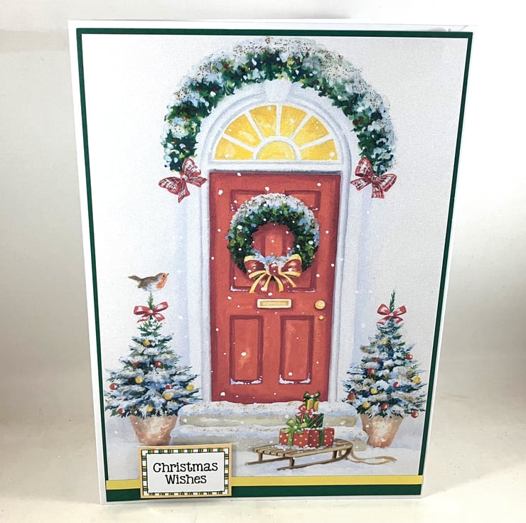 Handmade Christmas card featuring a printed image of a festive front door with garlands and wreaths and small decorated trees. The image has been mounted onto dark green card. The sentiment 'Christmas Wishes' has been added over a strip of gold foil. The snowy elements of the card have been glittered for a bit of extra sparkle.