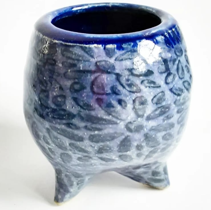 Glazed in navy blue glaze on the outside. It has a pattern around the outside