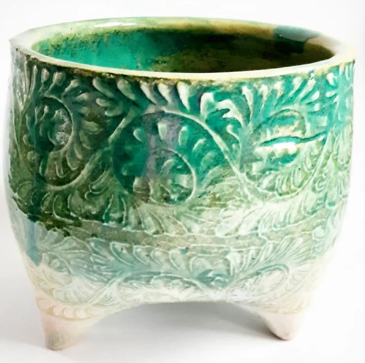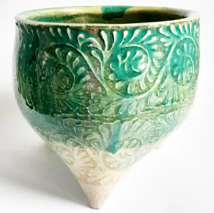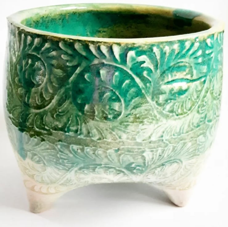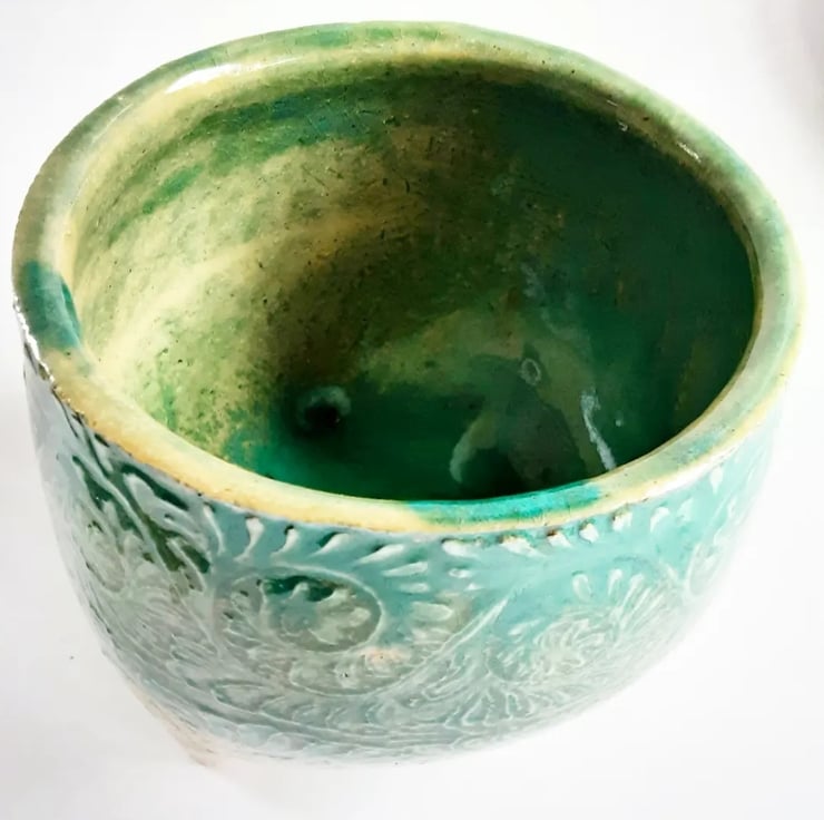 Glazed in green glaze on the outside and on the inside. It has a pattern around the outside
