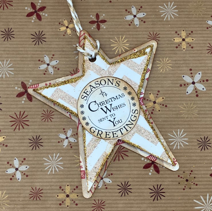 One design is made up of two stars cut from beige/white zigzag and red/beige seasonally patterned card. The smaller star has been edged with gold glitter and has a printed circular sentiment in the centre which reads: 'Season's Greetings' around the edge and 'Christmas Wishes sent to You' in the middle.