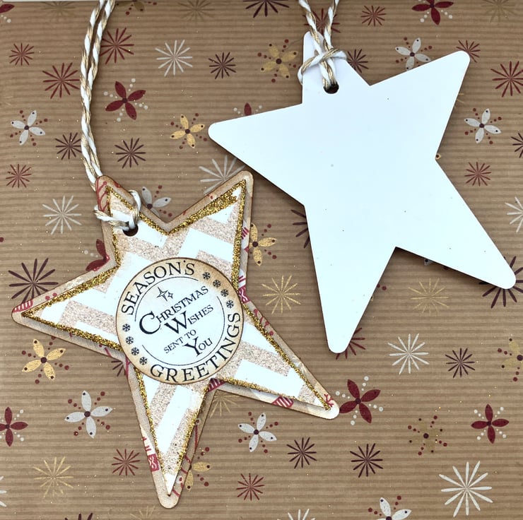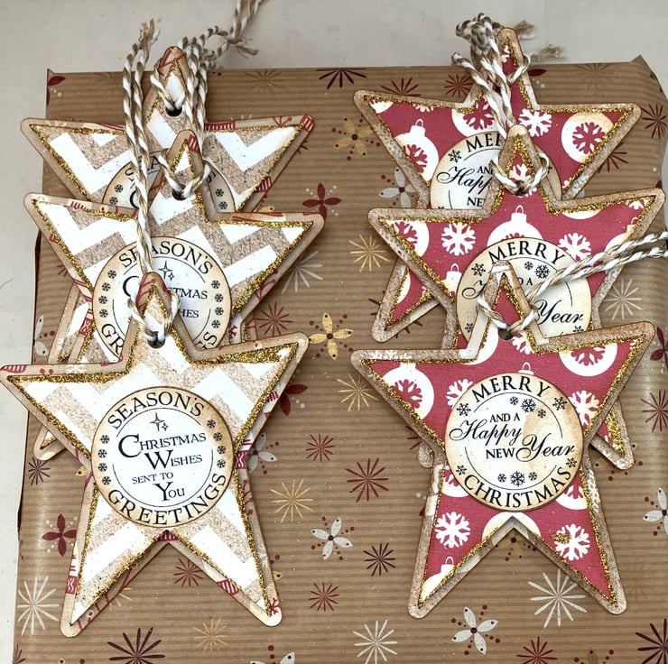 The second design has a smaller star cut from red and white bauble/snowflake card and overlaid onto a larger start cut from beige/white snowflake patterned card. The smaller star has been edged with gold glitter and has a printed circular sentiment in the centre which reads: 'Merry Christmas' around the edge and 'and a Happy New Year' in the middle.