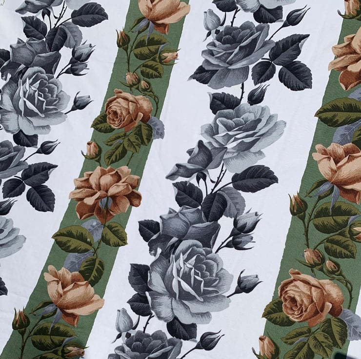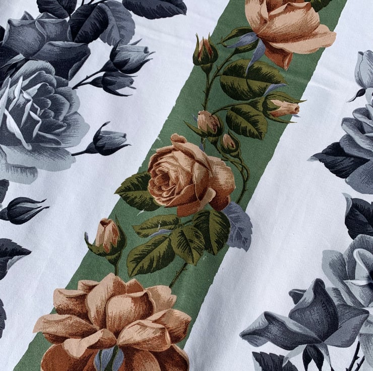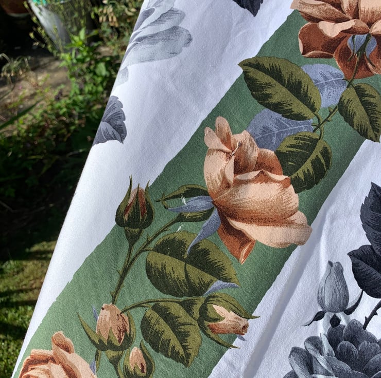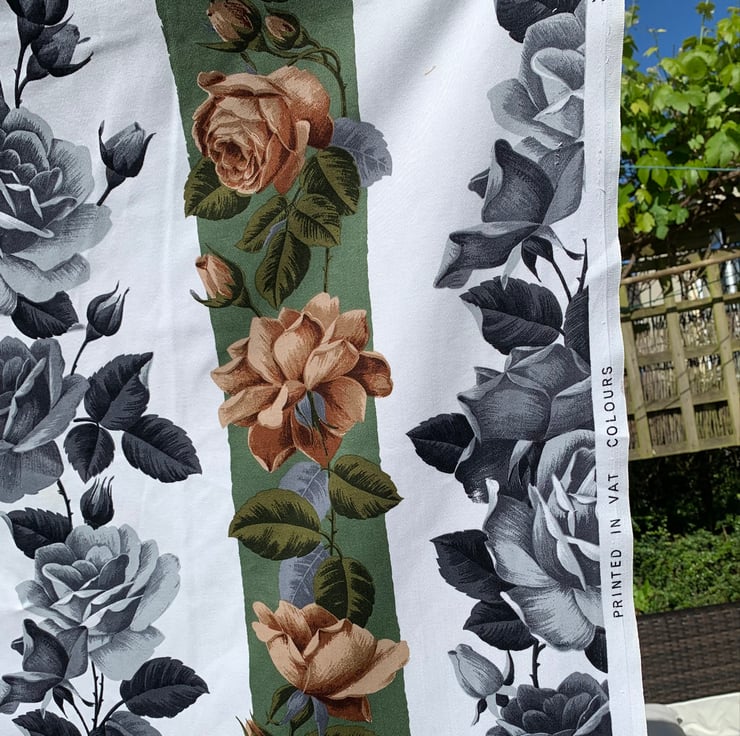 Good vintage condition , selvedge information , Colours bright, stitch marks on edged. Recycled from a curtain