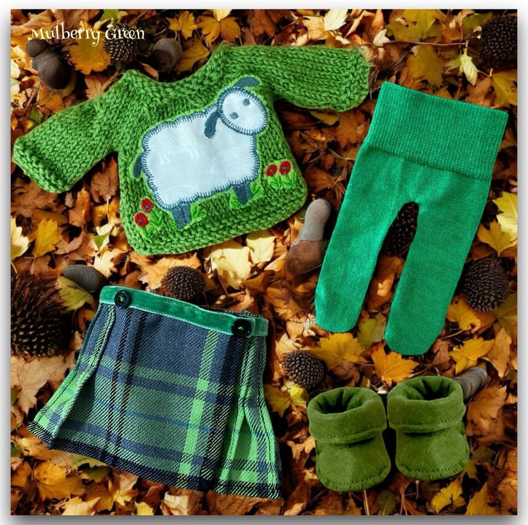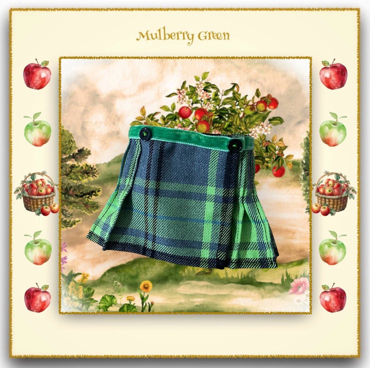 A sweet little green and black tartan kilt, to fit the Mulberry Green characters. The kilt is hand pleated and is finished with two little black buttons.