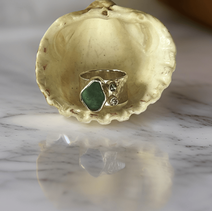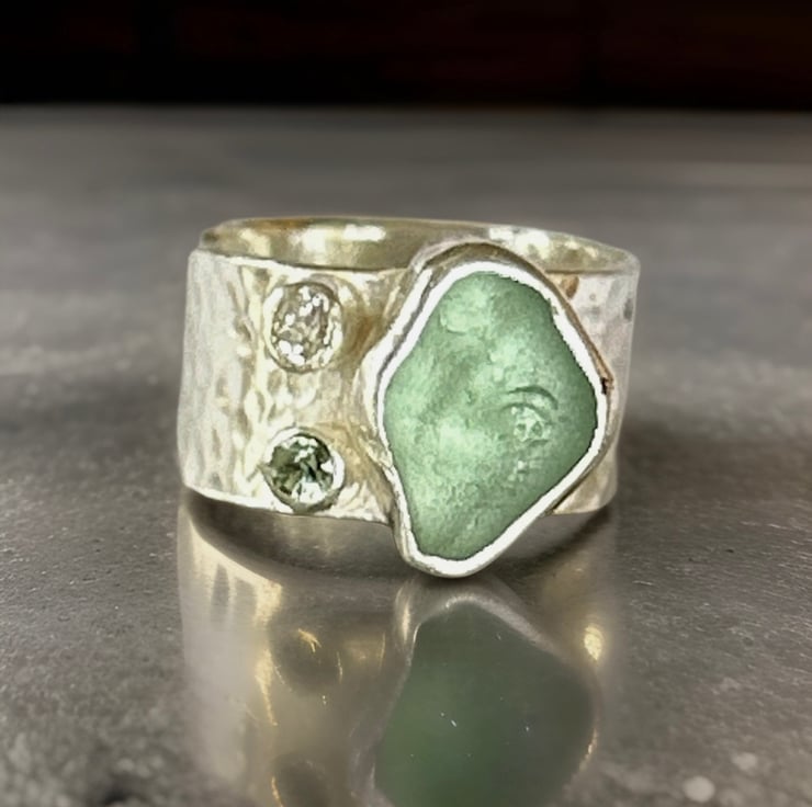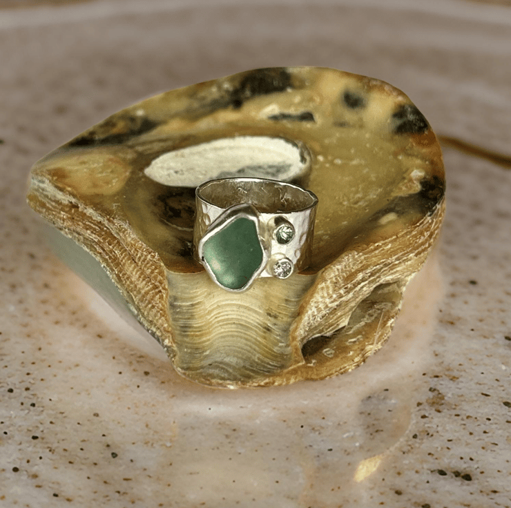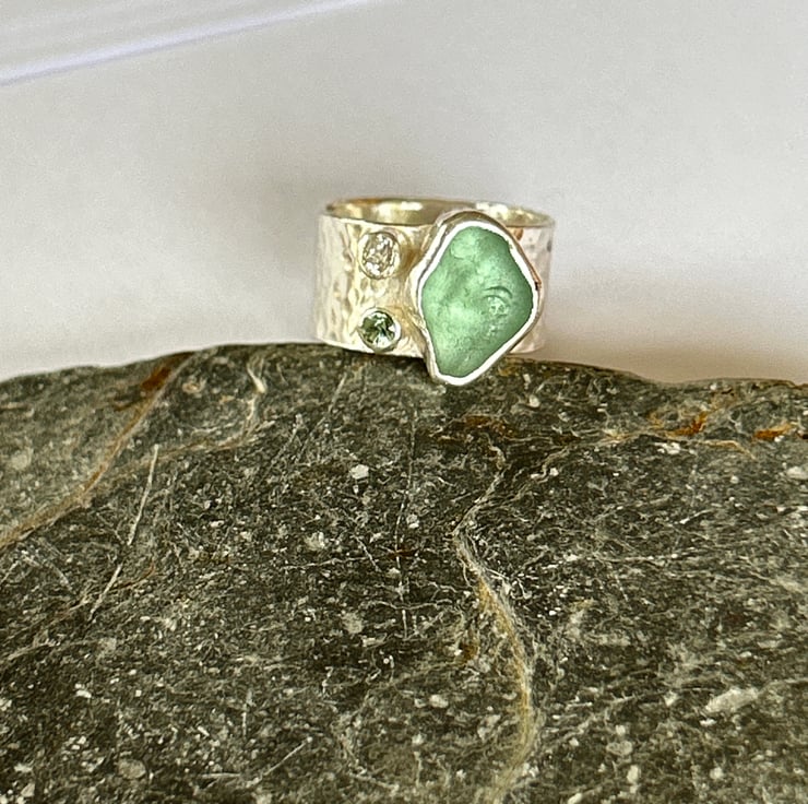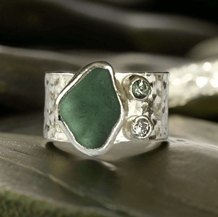 Exquisite bold yet elegant statement sterling silver ring, crafted with an organic hammered finish for a rustic yet refined ring. Featuring an enchanting piece of sea glass adding a touch of the oceans natural beauty to your style. The ring also features a 3mm green sapphire and a sparkling 3mm lab-grown diamond, creating a harmonious blend of natural elements and modern sophistication. Meticulously handcrafted, each ring is truly one-of-a-kind, celebrating both artisanal craftsmanship and unique materials. This piece is perfect for those who cherish timeless, earthy jewellery unique, artisanal jewellery with a touch of oceanic elegance.
