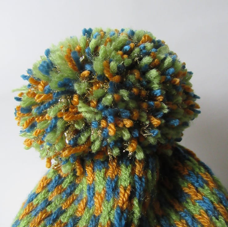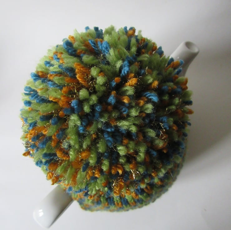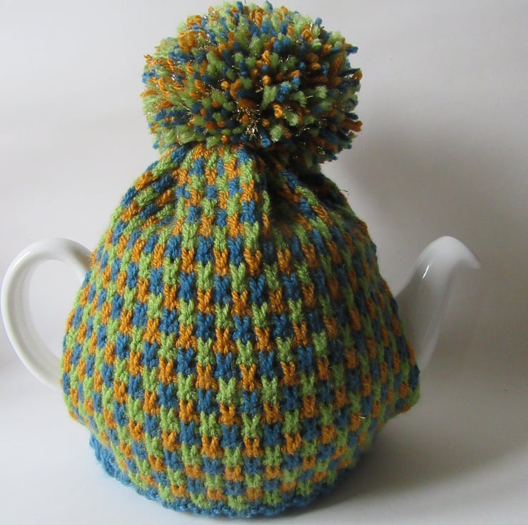 A hand knitted tweed stitch tea pot cosie using rich Christmas bauble colours of slate blue, gold and christmas tree green with an oversized pompom on top. Starting at the hem I have knitted the rib in slate blue. Then using three different coloured yarns; christmas tree green, slate blue and gold, I have knitted a wonderful tweed stitch tea cosie body. Adding an oversized pompom, nestled on the top, in the same three colours and glitter gold lurex yarn, gives extra sparkle to this classic Christmas tea cosy. This stitch ensures a good fit around the pot, yet has enough ease for a swift removal when a 'top - up' is required. The tea pot handle peeps through the side opening so it dosnt get too hot to handle. A perfect house warming gift, or for yourself...... just because it looks pretty on the kitchen work top at Christmas