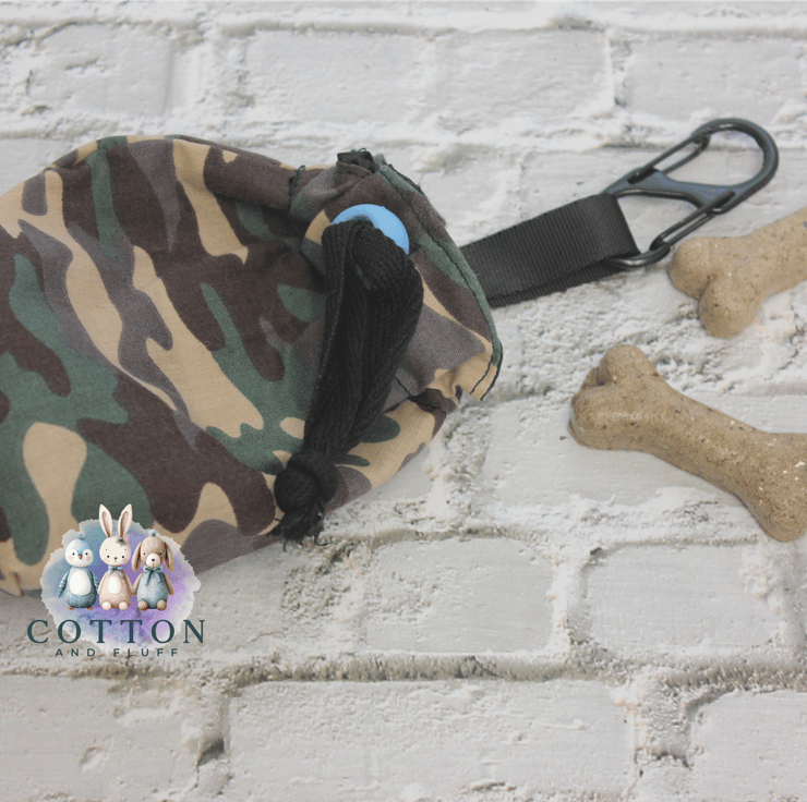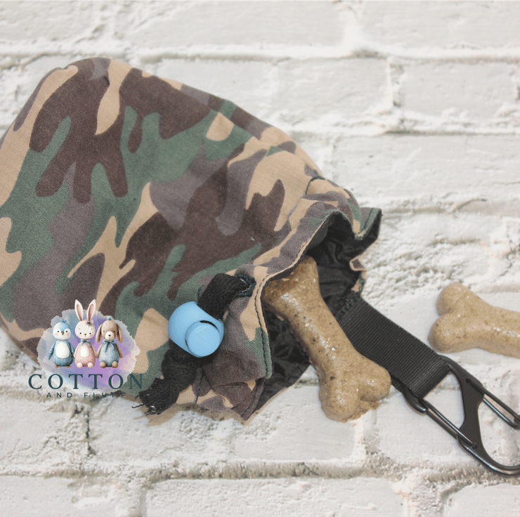 Dog training or treat pouch with wipe clean interior. The pouch has a drawstring closure so no treats fall out during activity. The pouch can be attached to belt, bag or clothing loop.