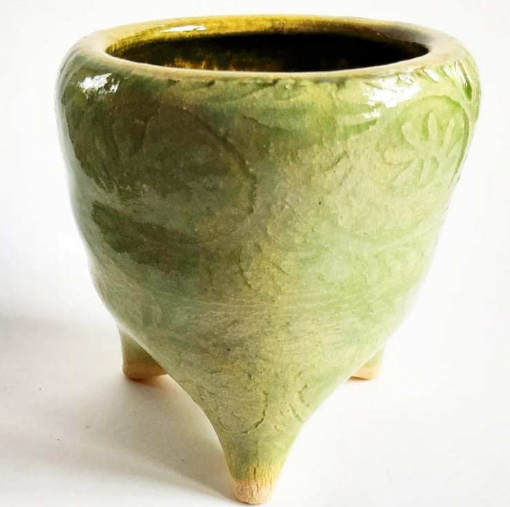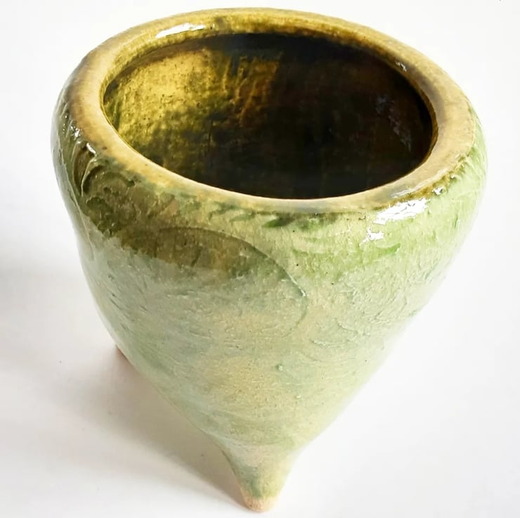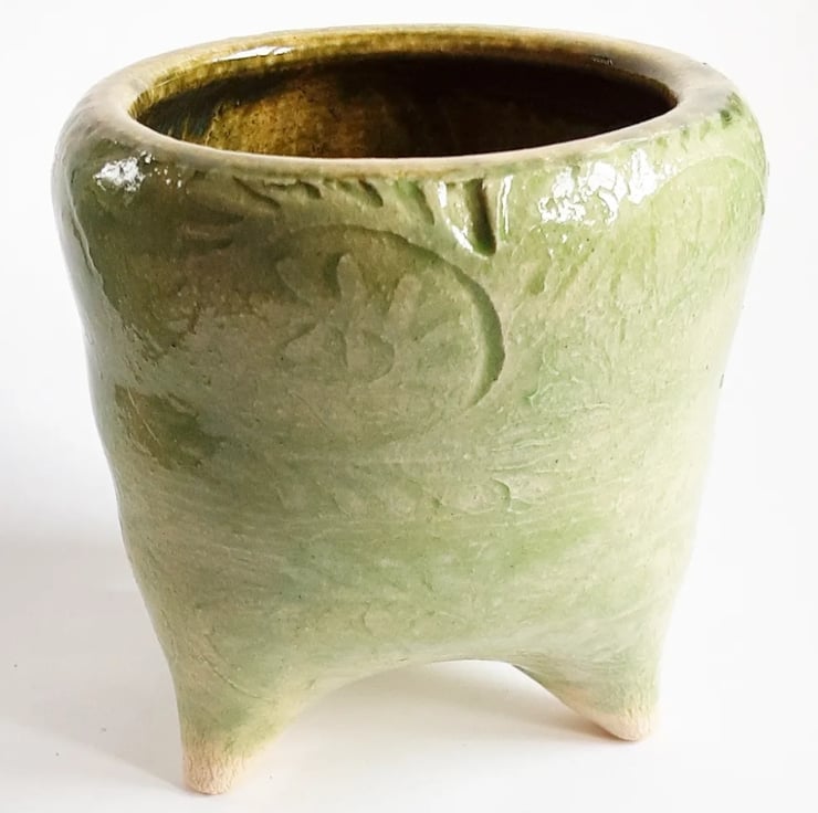Glazed in green glaze on the outside and brown on the inside. It has a pattern around the outside