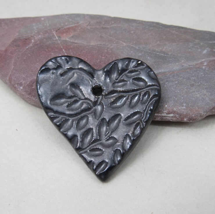 Medium heart shaped stoneware pendant, textured with a delicate leaf motif.