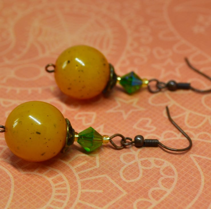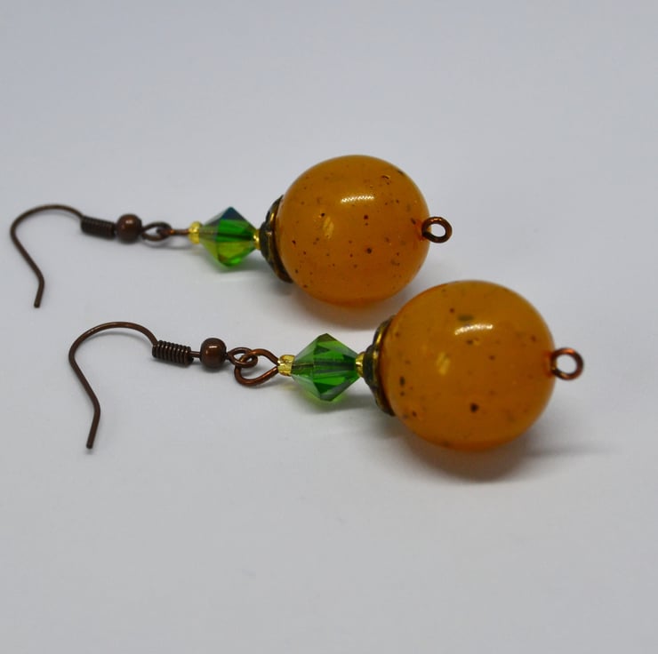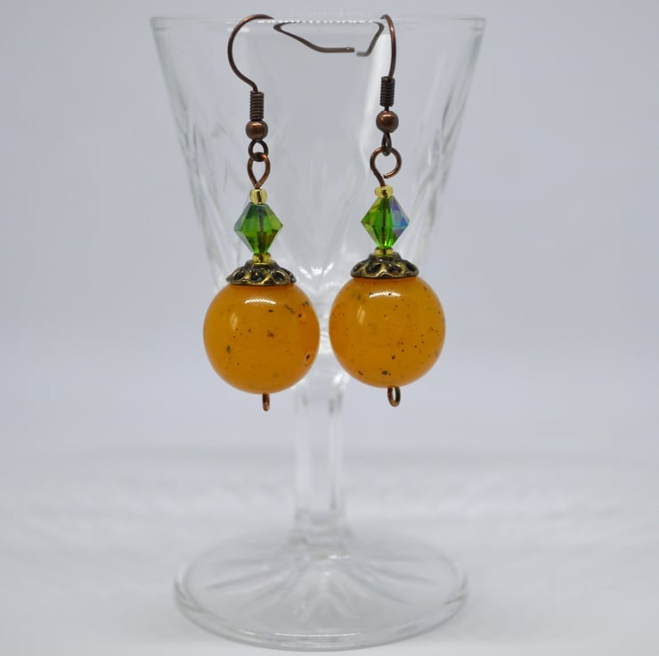 This pair of autumnal earrings are made using acrylic and glass beads with antique copper findings. They are in the style of a pumpkin, but can be worn throughout the year due to their design. They have a drop of approx. 3.5cm from the base of the ear wire. The ear wires are plated but can be changed to sterling silver or rhodium plated at checkout.