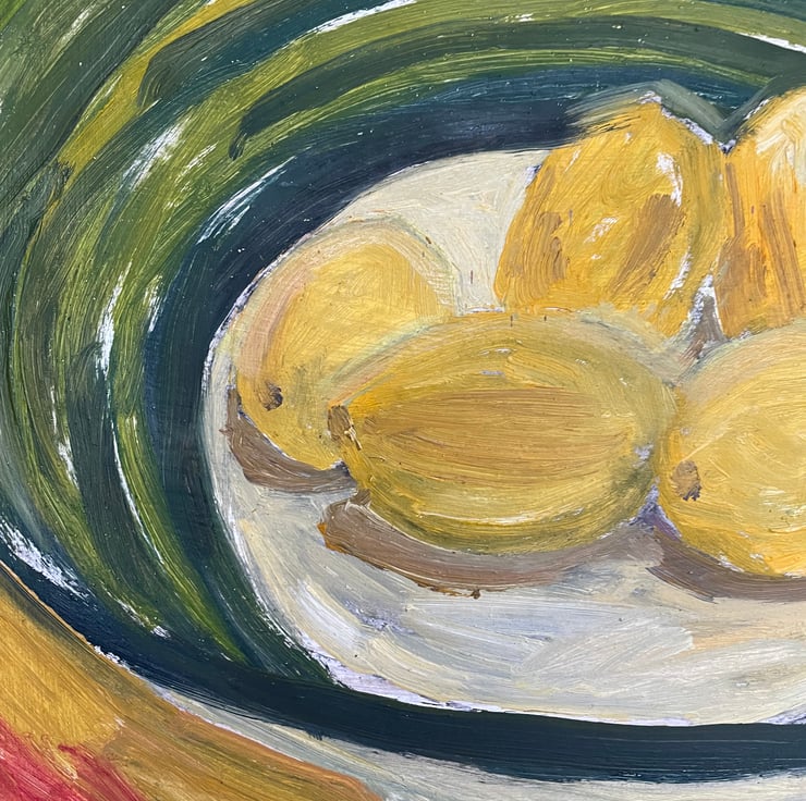 I visited Charleston this year and am really inspired by the art of Duncan Grant and Vanessa Bell, who in turn were inspired by Cezanne, another of my great idols. Here is a painting of lemons in a fruit bowl on a warm August day.