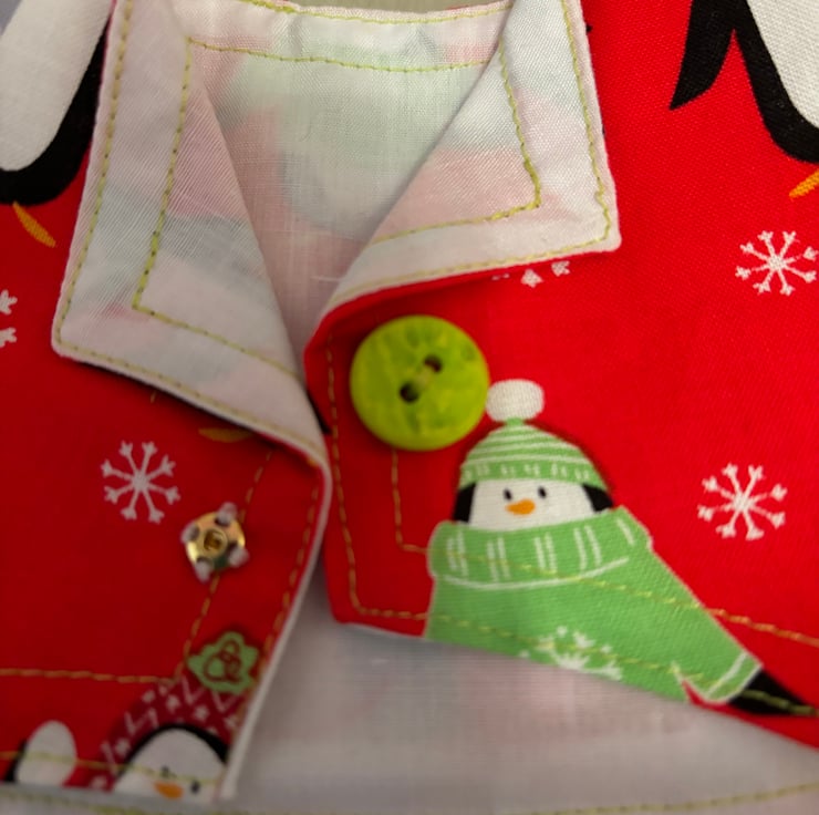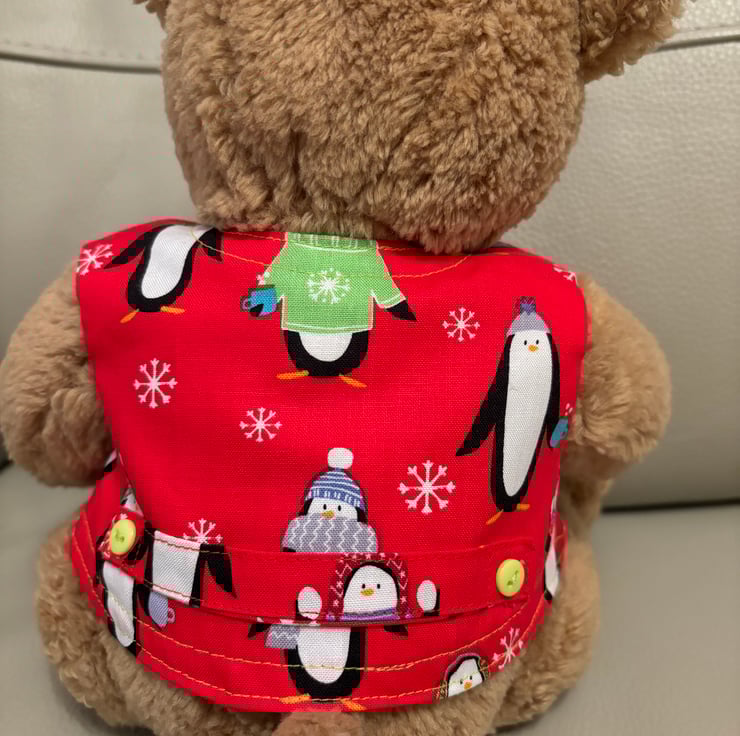 This is a large size waistcoat. Made to fit a teddy approx 19”/48cm tall. This will also fit The Build a Bear Teddies. A Christmas theme featuring penguins. The waistcoat is fully lined.