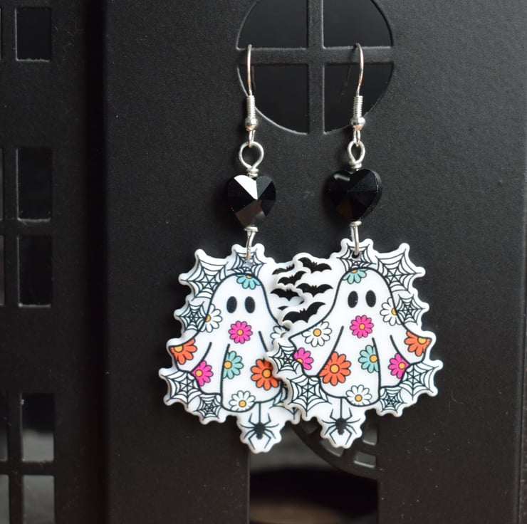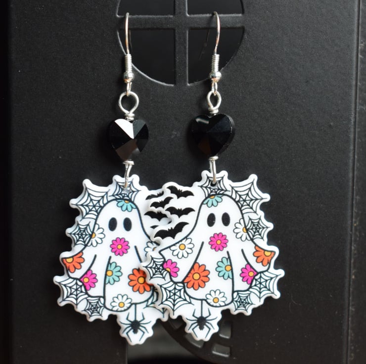 These earrings have lightweight acrylic ghosts that have flowers on their sheets and are surrounded by bats and cobwebs. They hang below faceted black glass hearts for a little bit of twinkle and the earwires are silverplated. Don't have pierced ears? Not a problem, I can also swap these for clip on findings, just choose that option at checkout.