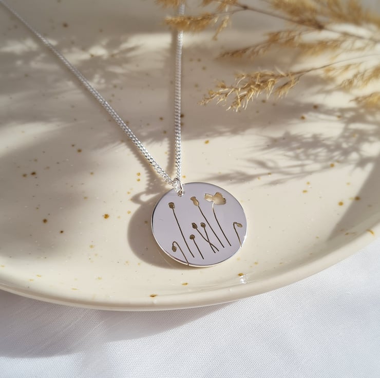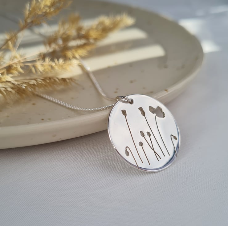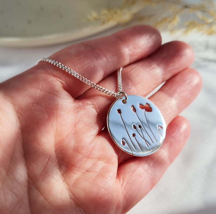 Using traditional silversmithing techniques of hand piercing this stunning pendant if made from solid sterling silver, featuring dreamy poppy silhouettes blowing in the breeze. A perfect gift for those who love nature and wildflowers and the British countryside.