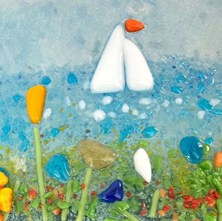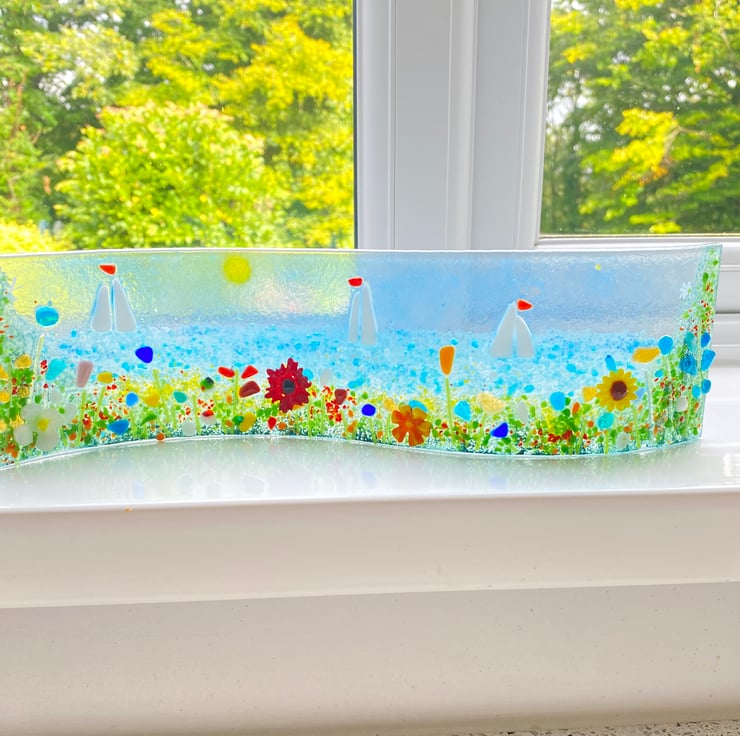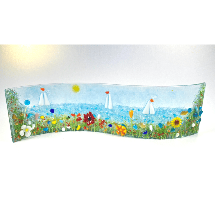Pretty fused glass beach scene in a stand up wave shape . These look lovely stood on a mantle piece Window sill or shelf . They are approximately 3 inches tall and 12 inches long . Perfect gift for ghost s was hi love tranquility, the beach or are sailing enthusiasts .
