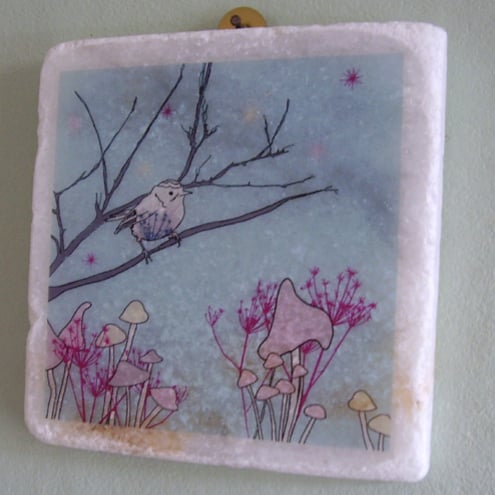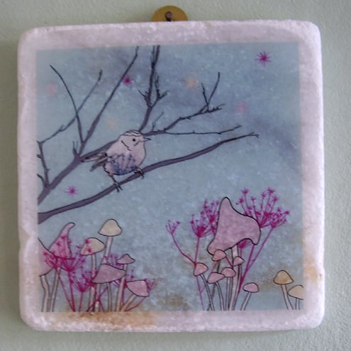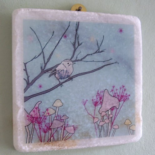 white marble tile featuring an original 'littlebirdy' design to hang on your wall!