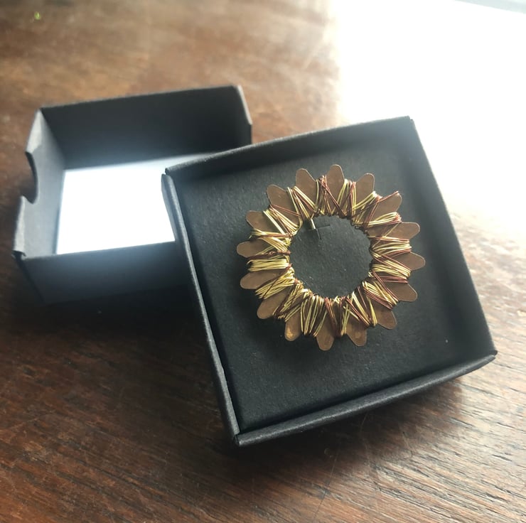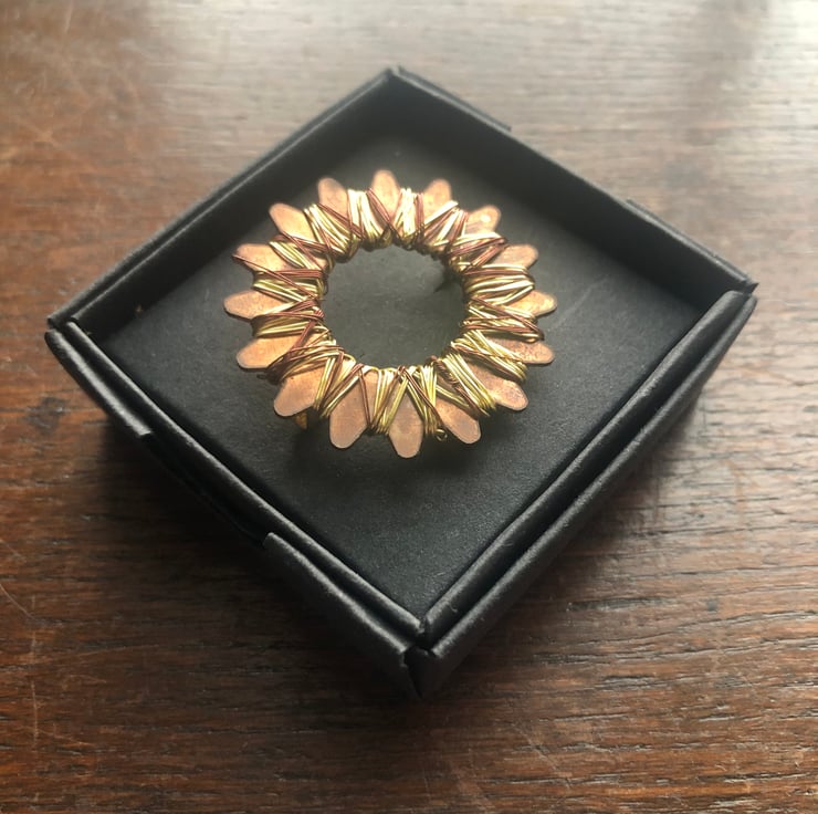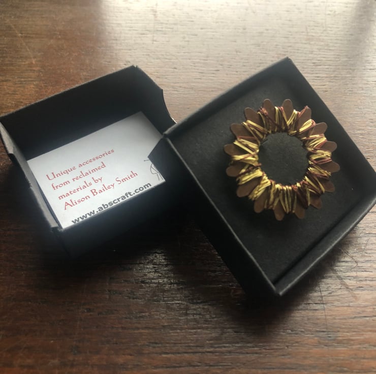 Wrapped cog eco brooch with repurposed materials - copper cog, wire from TVs and gold plated pin