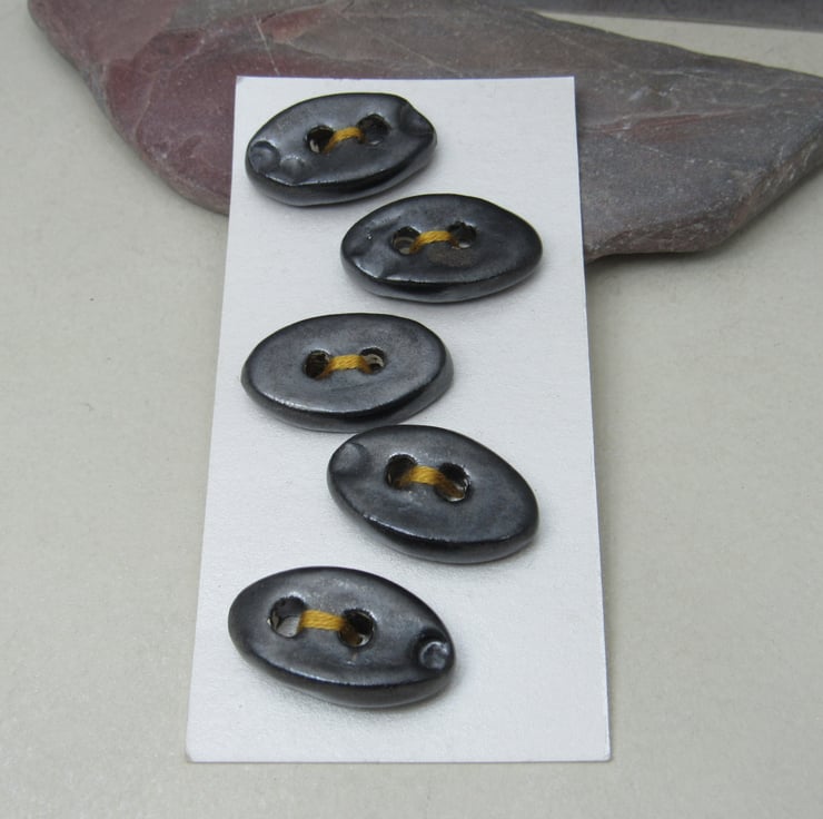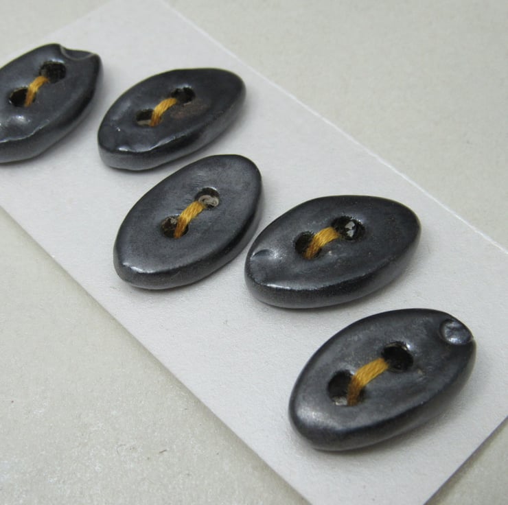 5 small oval stoneware buttons finished with a dark metallic glaze